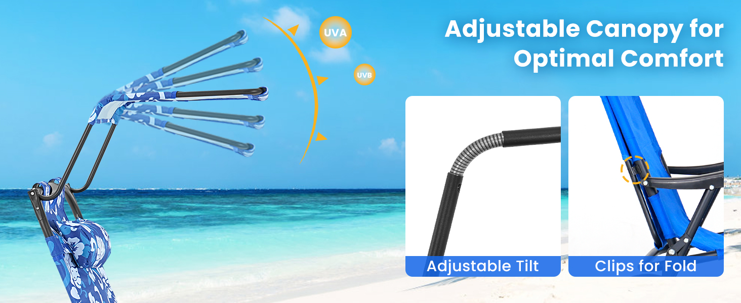 PREMIUM MATERIALS - Crafted from high-quality, UV-resistant Oxford fabric and supported by a sturdy steel frame.The adjustable canopy and removable headrest pillow provide extra comfort and protection from the sun, enhancing your outdoor experience