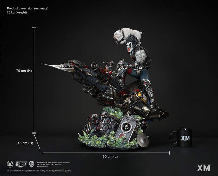 LOW EDITION NUMBER! SHIPS FROM USA! You asked for it... And we've delivered! XM Studios is excited to present a highly anticipated release, our next 1:4 DC Premium Collectible, Lobo! Each painstakingly handcrafted statue is individually hand-painted with the XM quality finish, and comes in a bold, dynamic, and story-laden style. In 2019, XM released the 1:6 scale version of this statue, and ever since that release, we've had several collectors asking us if we'll ever be doing up a 1:4 version. For this larger-scaled version, the XM Design and Development Team has retained everything that made collectors fall in love with the 1:6 version, with a few key differences. The base, for one, has been changed to feature chained up stereos with metallic and spiky motifs that stay true to The Main Man's unique style. Also new to this release is a head switch-out featuring Lobo sticking his tongue out and an additional right-hand switch-out, in which he is holding on to a base guitar, ready to belt out some chords. As with the 1:6 scale version, Lobo is seen riding atop his “space cycle”, which he named the Spacehog, displayed in its full glory with bellows of green smoke underneath, reminiscent of the smoking effects seen in concerts, taking on the form of misshapen skulls. Character Background: The Last Czarnian and "The Main Man," Lobo is the most badass bounty hunter in the galaxy. He’s the best bounty hunter in the known universe and the last sentient being you’d ever want to get into a bar fight with if you hope to make it out in one piece. He’s the intergalactic alien badass known as Lobo, often called by his nickname “The Main Man,” and if you’re lucky, you’ll never cross his path. You might be asking yourself why an alien being would be named after an Earth animal, even one as fierce as a wolf. That’s because the word “Lobo” in this instance translates into “he who devours your entrails and thoroughly enjoys it” in the ancient Khund dialect. Turns out, his parents could not have given him a more fitting name. Riding around the spaceways on his “space cycle,” which he named Spacehog, Lobo exhibits all the traits someone would associate with a biker in a Hell’s Angels-style motorcycle gang on Earth, from his long hair and tattoos, down to his kill or be killed attitude. Over the years, Lobo has fought on the side of both the good guys and the bad, pretty much just drifting towards whoever pays him the most to get the job done, or which side promises him the better, bloodier fight. He’s tussled with Superman and the Justice League, and just about every superhero in the DC Universe. The Lobo (Rebirth) Premium Collectibles statue features:Three (3) Portrait: 1 with goggles, 1 with longer dreadlocks, 1 with his tongue sticking outThree (3) Right-Hand: 1 holding his signature weapon: hook on a chain, 1 holding a base guitar, 1 holding Dawg in the air!Two (2) Left-Arm: 1 holding the handle bar, 1 in a rocking out poseHighly detailed sculpt featuring The Main Man perched on his crazy cool Spacehog, Dawg by his side as he speeds up in pursuit of his current target.Crafted in polystoneEach painstakingly handcrafted statue is individually hand-painted with the high quality finish Artists Involved:Ario Anindito, Foo Tze Wei (2D)Alvaro Ribeiro, Nillo Samyr (Sculpt)XM Studios Design and Development Team Manufactured by: XM Studios Product Size (LxBxHt): 90*45*70cm