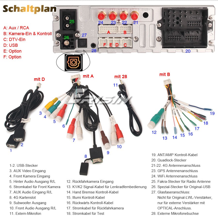 - Rückfahrkamera inkl.: Nein, Sie können CVBS oder AHD Kamera von uns mitbestellen