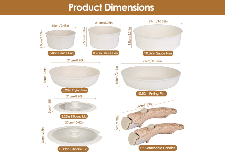 - 9Pcs Complete Cookware Set:Our 10Pcs complete cookware set comes with 7.48in/8.26in/10.62in sauce pan,8.26in/10.62in frying pan,2* removable handles and 2* matched lids. You can get all kitchen cooking essentials in one package,which easily satisfy various daily cooking demands for you and your whole family.