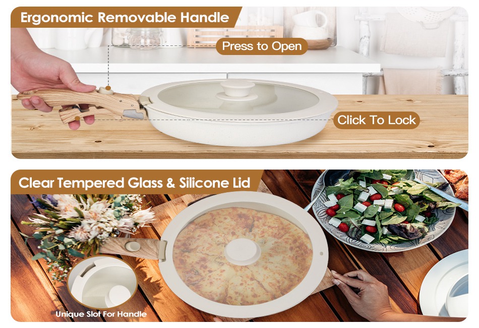 - Wide Compatibility:Suitable for all stovetops,such as oven,induction,gas,electric,and ceramic cooktops.(The handle is not support oven cooking.) Detachable handle design makes this nonstick cookware set also can be used to serve on the table. An ideal gift for family and friends.