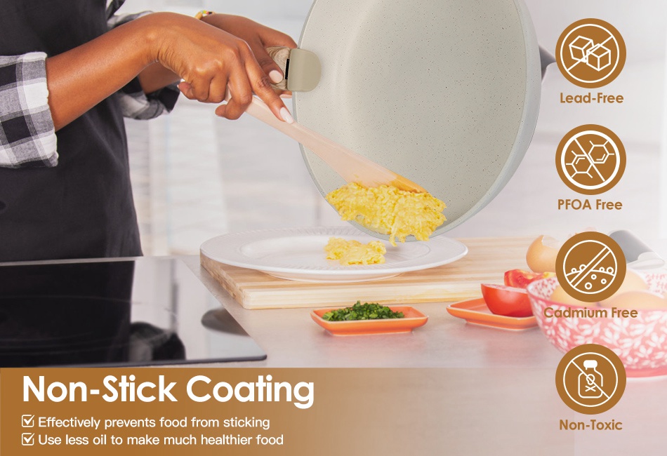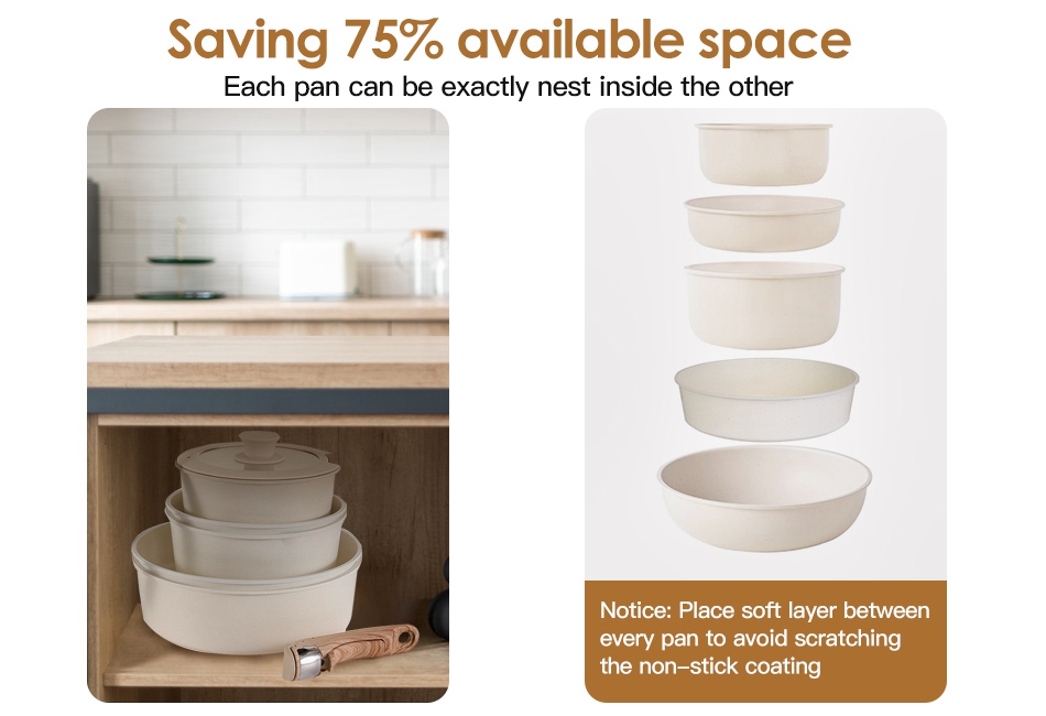 - Non-Stick Granite Coating:Advanced granite coating technology is free of toxic chemicals and effectively prevents food from sticking. Due to its excellent non-stick performance,you can use less oil to make much healthier food in your daily life. Moreover,each pan can be exactly nest inside the other,saving available space when storage. Just pay attention to place soft layer between every pan to avoid scratching the non-stick coating.