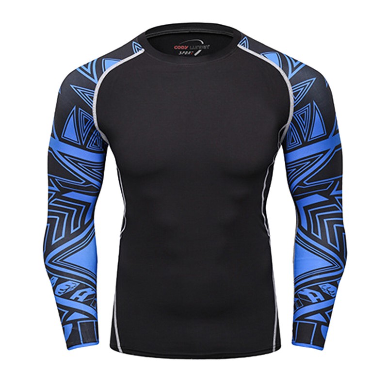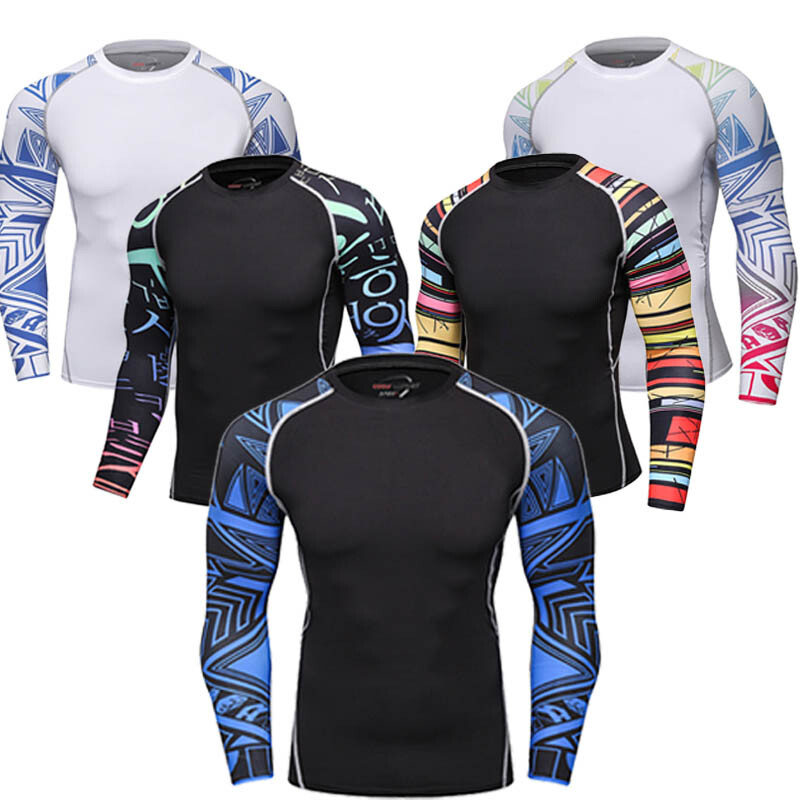 Mens Moisture-wicking compression rashguard long sleeve high elastic print fitness tops for sports gym.