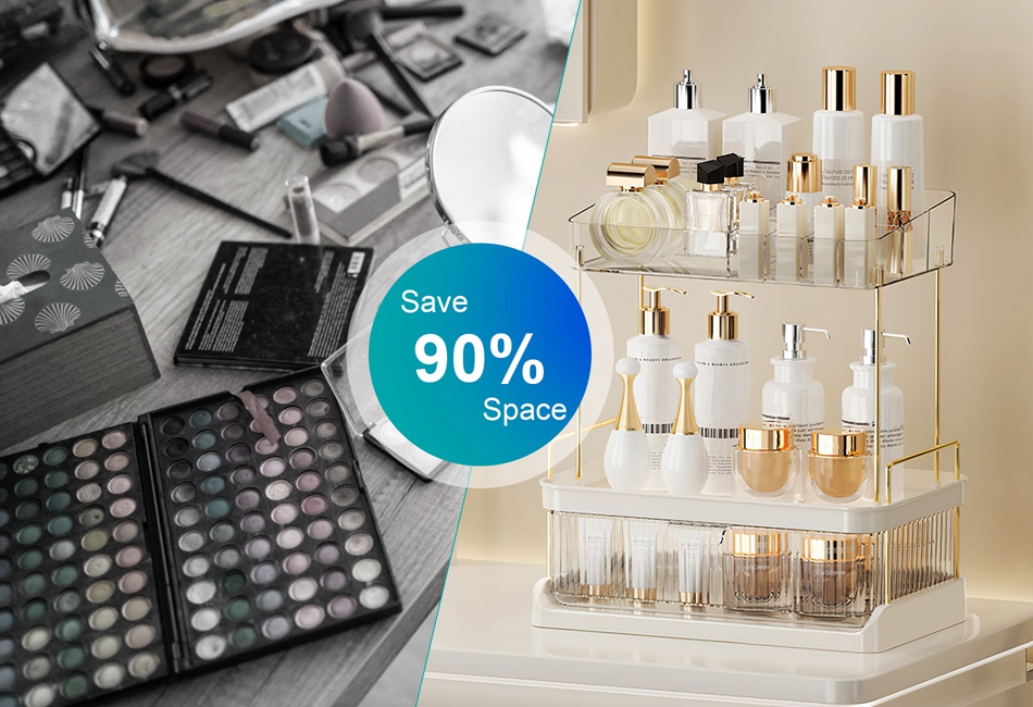 - Large Capacity:Top Layer Size:11.02x6.89x2.36in;Middle Layer Size:12.4x8.27x7.68in;Bottom Drawer Size:11.61x7.48x2.95in. This skincare organizer can maximize your desk space by up to 90%. Say farewell to your cluttered countertop with our makeup organizer!