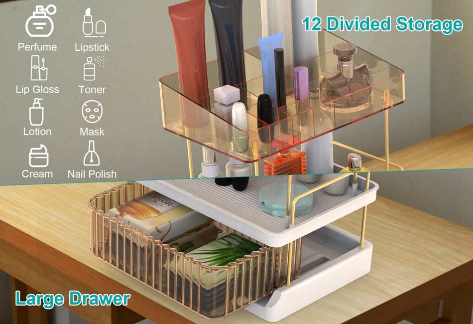 - Multifunctional & Versatile:The top layer of our dresser shelf equips with 12 dividers of different sizes. The middle layer features 7.68in height. The drawer is easy to pull in or out. Perfect for storing a wide range of beauty products,including perfumes,skincare items,lipsticks,nail tools,high-bottle lotion,high-bottle toner,facial cleanser or makeup remover etc.. Provide you with a clean,tidy and orderly bathroom counter.