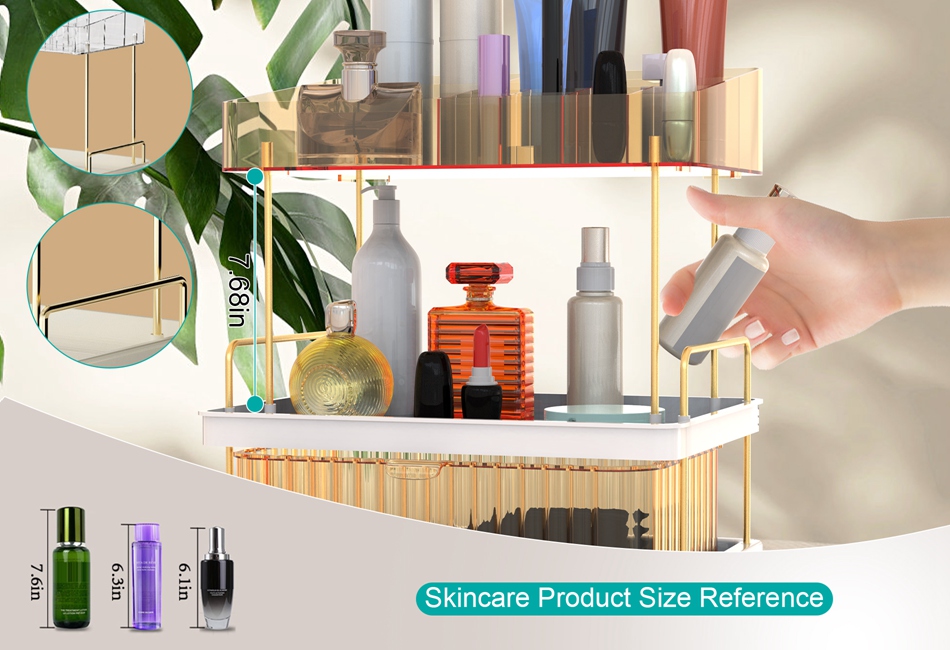 Looking for a luxurious organizer for your makeup? Our makeup organizer is aesthetically pleasing with its gold and clear/champagne hue. 2 Tier storage and 1 drawer not only offer ample space for perfumes, skincare items, lipsticks, nail tools, high-bottle lotion, high-bottle toner, facial cleanser or makeup remover etc., but also keep them easily accessible and visible. An irresistible gift choice for your wives, girlfriends, colleagues, besties. Surprise your loved ones with this vanity storage organizer for special occasions like Christmas or Valentine's Day.