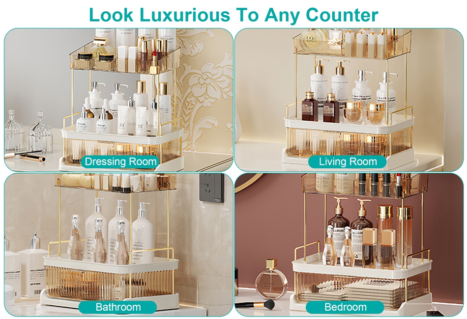 - Luxury Aesthetics:The gold and clear/champagne hue adds a touch of luxury to to your vanity,making this makeup organizer not only functional but also aesthetically pleasing. A perfect addition to any decor style.