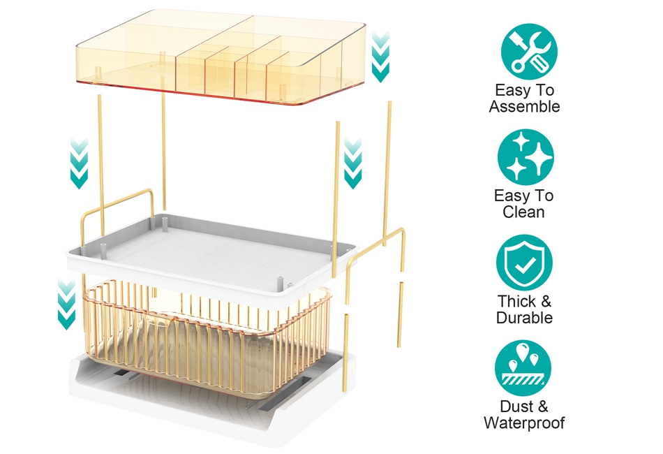 - Easy To Assemble:Made of premium PET,durable and sturdy. This bathroom countertop organizer is easy to assemble. Just insert the handles and brackets into the corresponding holes,then take out the top layer and assemble.
