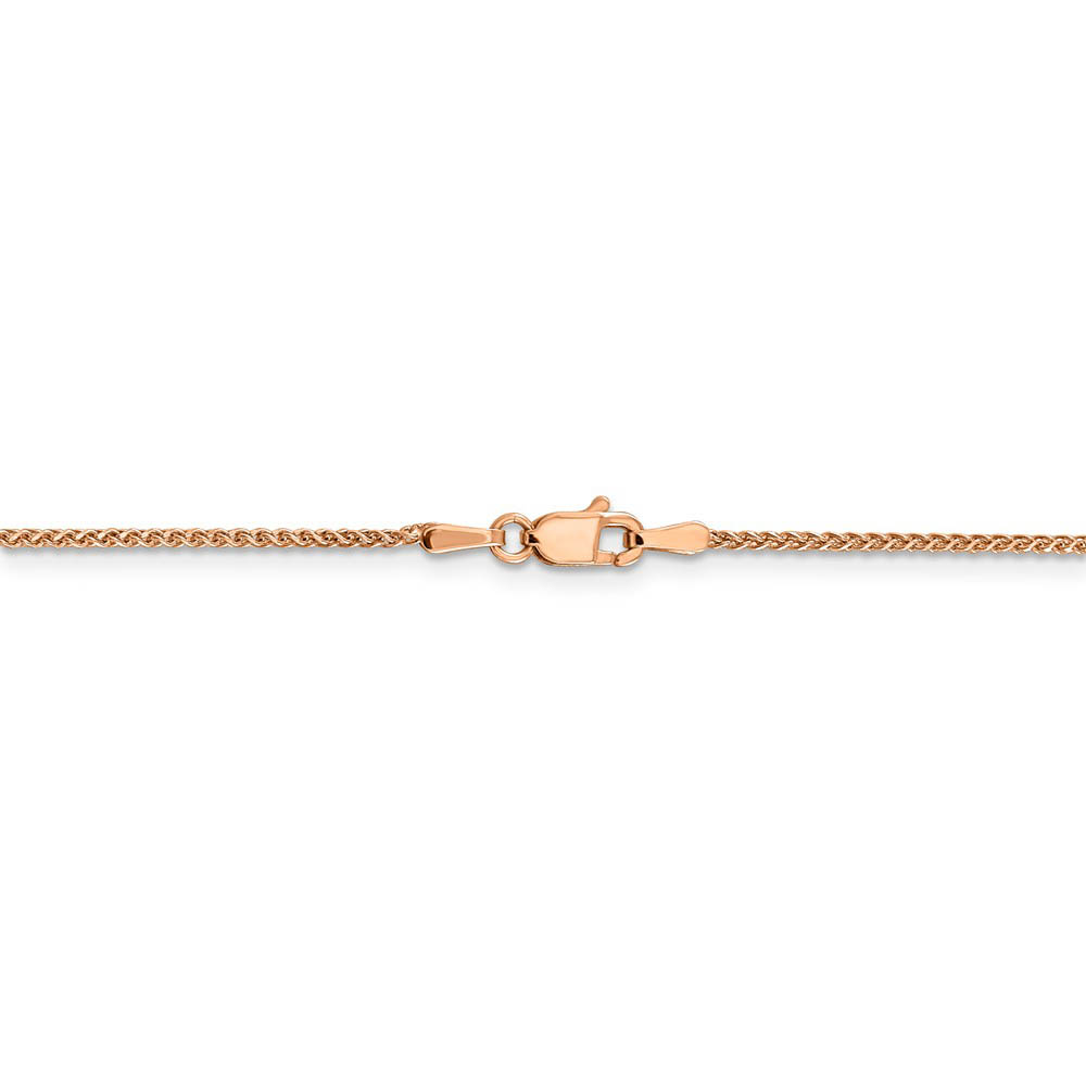 Solid polished links of 14k rose gold are plaited together to create a strong spiga (wheat) design for this 1.2mm width, 20-inch long necklace chain that closes with a lobster claw clasp. While this style is not as flexible or liquid-like as some other styles, it will complement your favorite charm or pendant to perfection with its intricate style.
