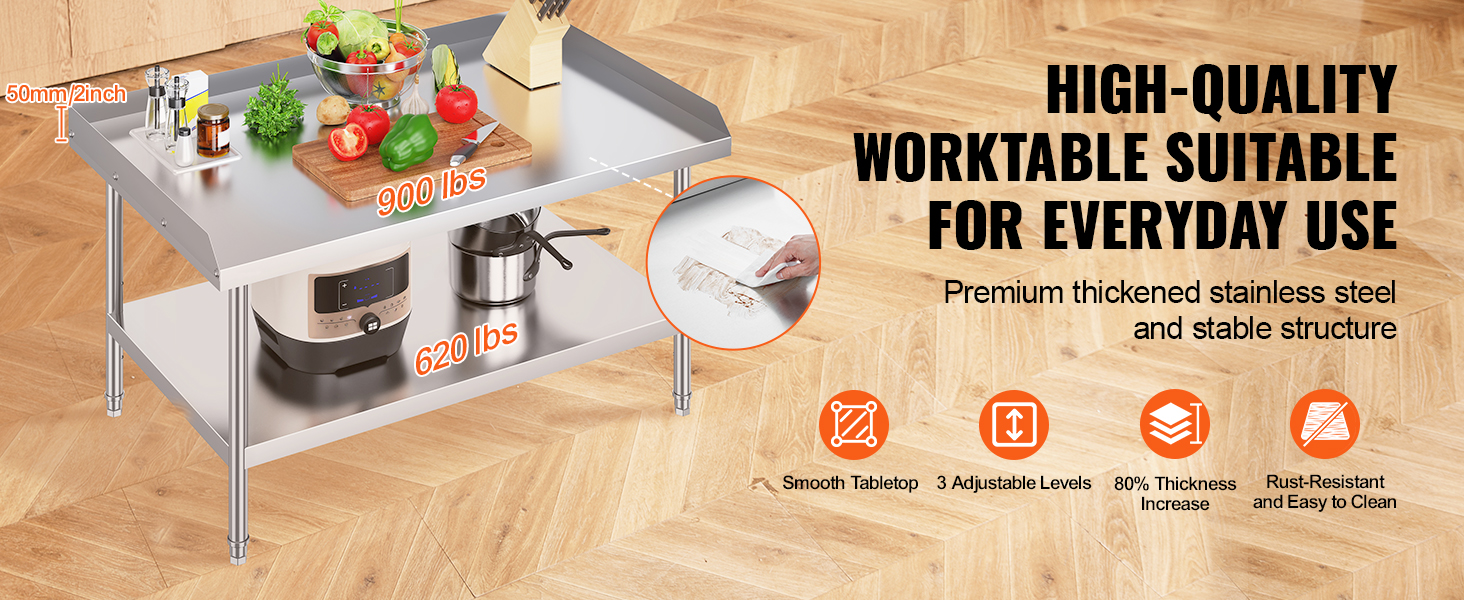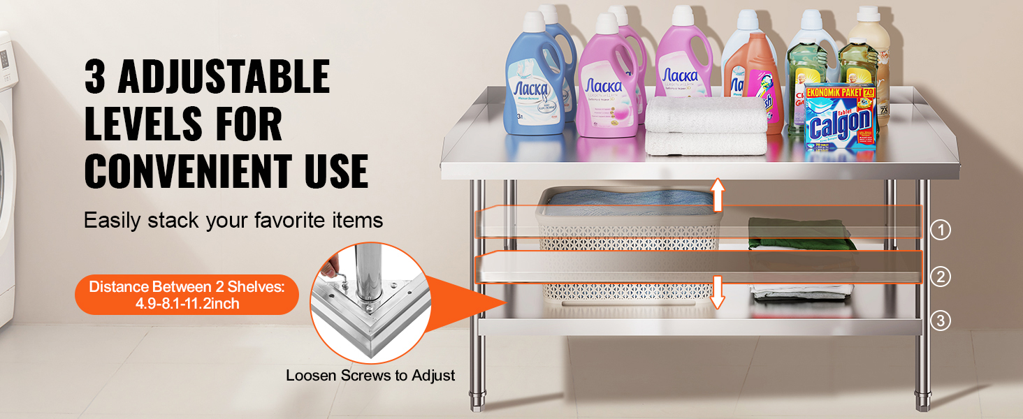 User-Friendly Design: Featuring 3-level adjustable shelves, this work table offers the most user-friendly and practical functionality. Simply adjust the shelf height with screws to accommodate items of different sizes. The 2-inch edge backsplash prevents valuable equipment and supplies from sliding off the table and also protects against water splashes.