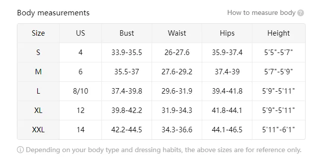 Please check the measurement chart carefully before buying, the right size will make you look more attractive!