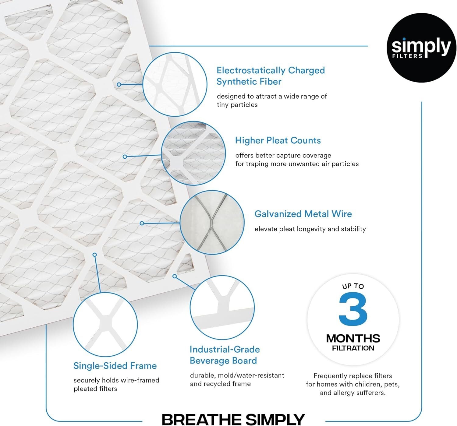 You and your loved ones deserve a breath of fresh air, especially in the comfort of your own home! But various factors can make the air you breathe impure and contaminated. With Simply Filters, breathing will be a lot more refreshing. With our advanced pleated technology that provide less air flow resistance, these filters can help eliminate dust, dust mites, pollen , mold spores, lint, pet dander, household debris, and more Allergens. We stand behind the quality of our filters! Proudly Made in USA.