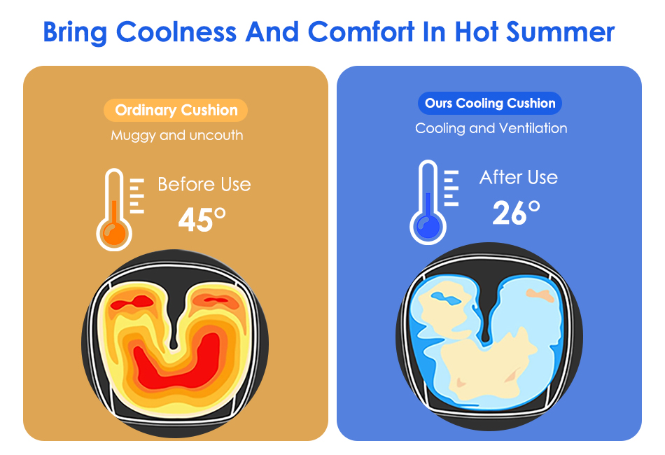 - Cooling Sitting In Summer:Our innovative cooling sitting cushion adopts unique water cooling system to maintain the seat cushion at a constant 26°C/78°F temperature,which 10°C/50°F lower than your body temperature. Compared to normal seat cushion,this thermostatic cooling seat cushion eliminates the discomfort of sitting in sweltering,muggy conditions,but brings you a cool and comfortable sitting experience.