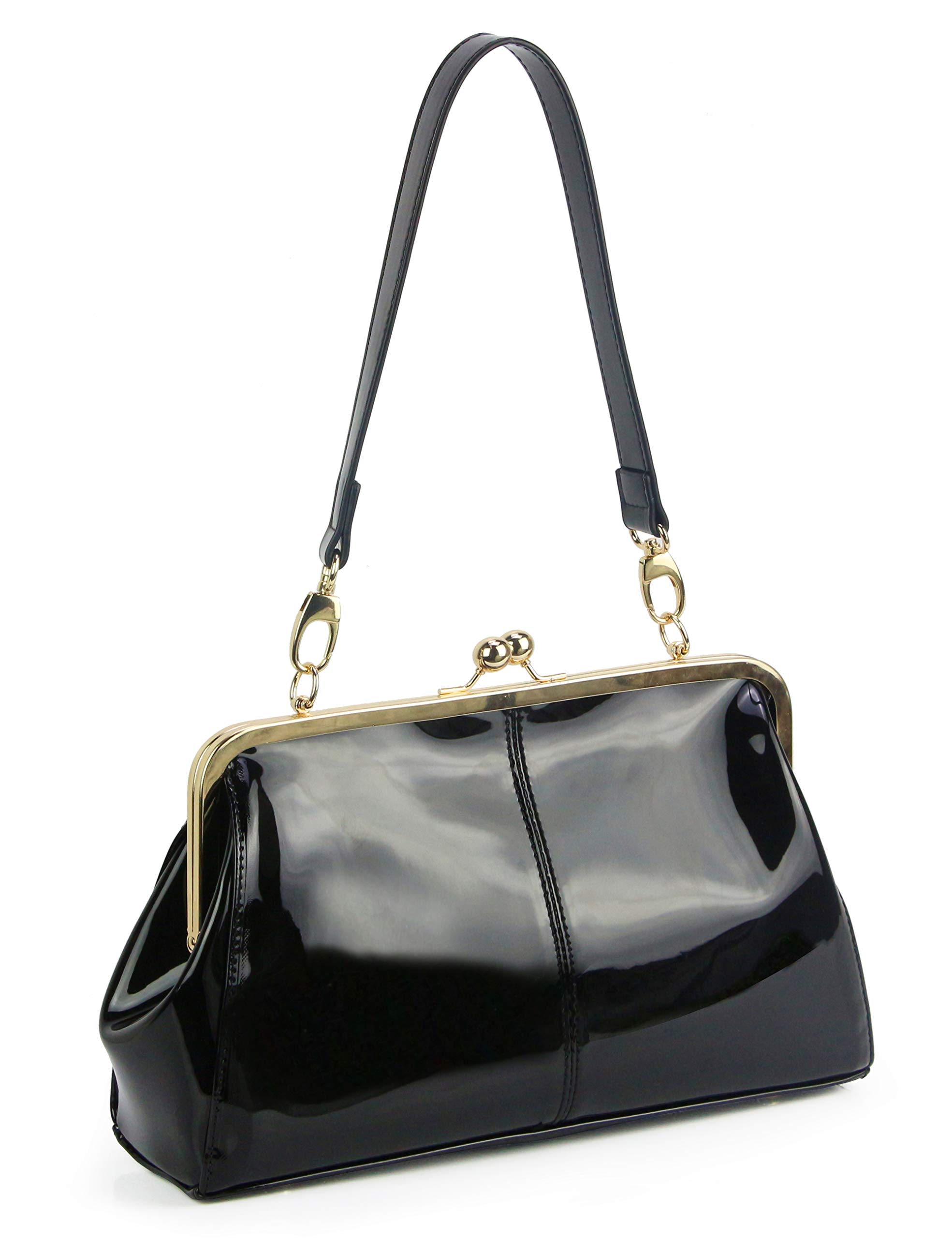 Vintage Kiss Lock Handbags Shiny Patent Leather Evening Shoulder Tote Bags with Chain Strap (Black) Medium
