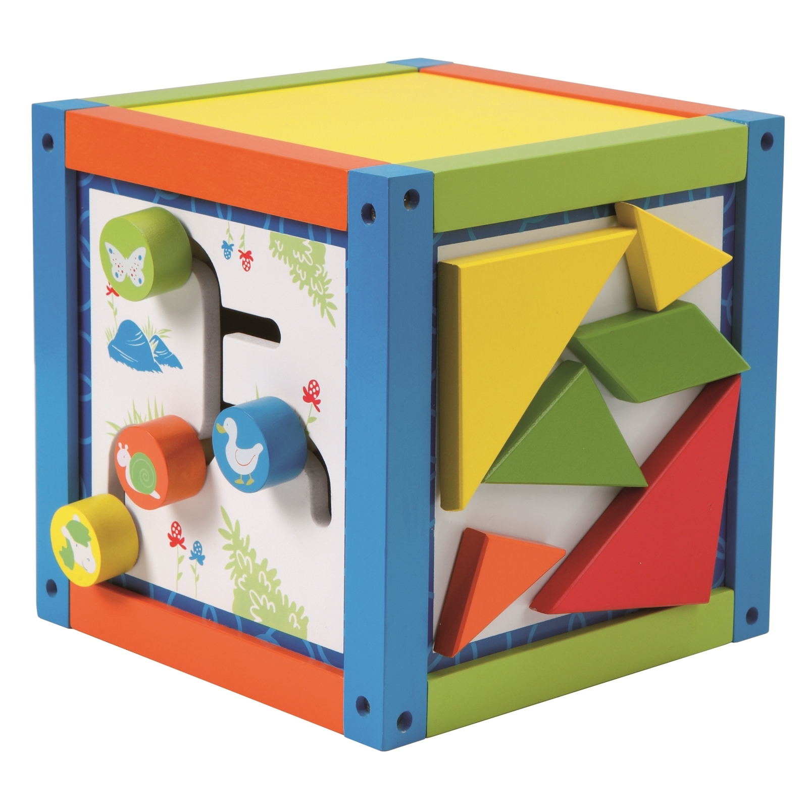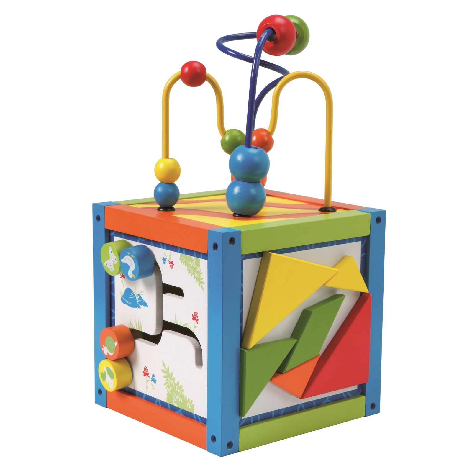 Koordination von Auge und Hand, die Feinmotorik, Wahrnehmung von Farben, Formen und Größen, das Erlernen der Uhrzeit, sowie der Gehörsinn werden in unserem 16x16x16 cm großen Aktivwürfel auf spielerische und lustige Art geschult. Grundmaterial: MDF (lackiert), Material 2: Massivholz