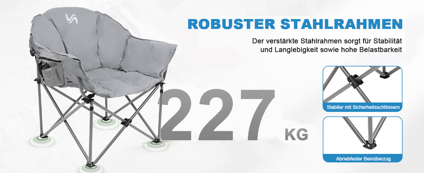 【Stabil Hohetragfähigkeit Mondstuhl】Solide rahmen aus legiertem stahl, ergänzt durch die diagonale stützhalterung zwischen den vier beinen wird die gesamtstabilität verbessert, plus stuhloberfläche besteht aus reißfestem 600D Oxford-Stoff, hält bis zu 227kg aus.