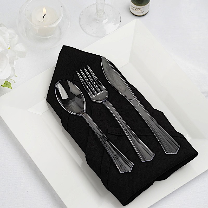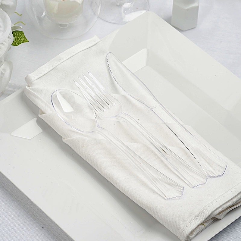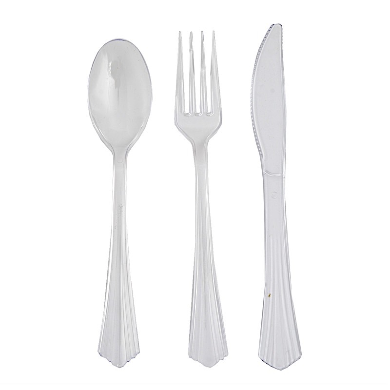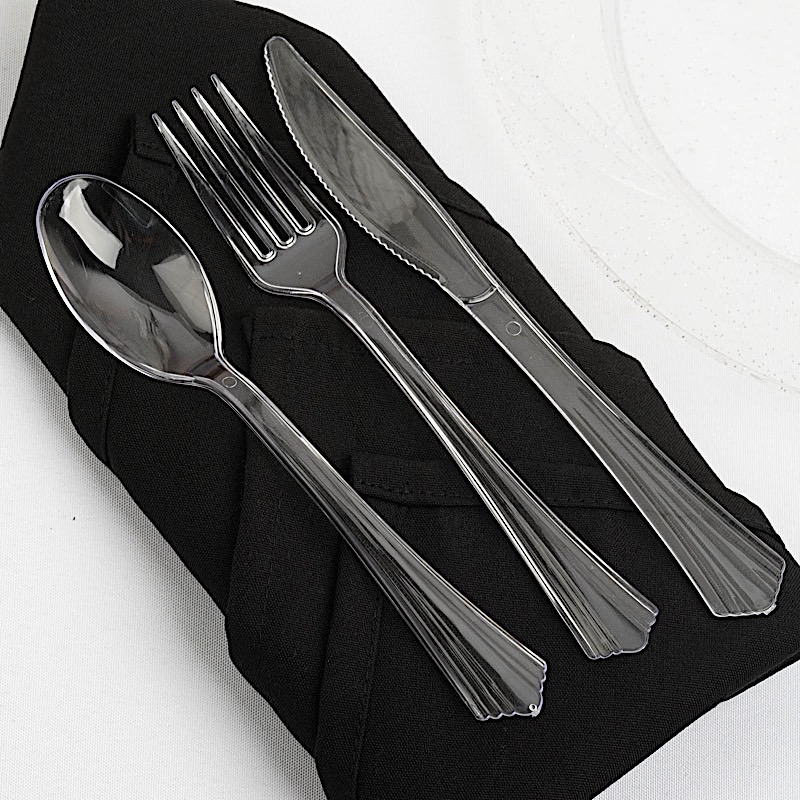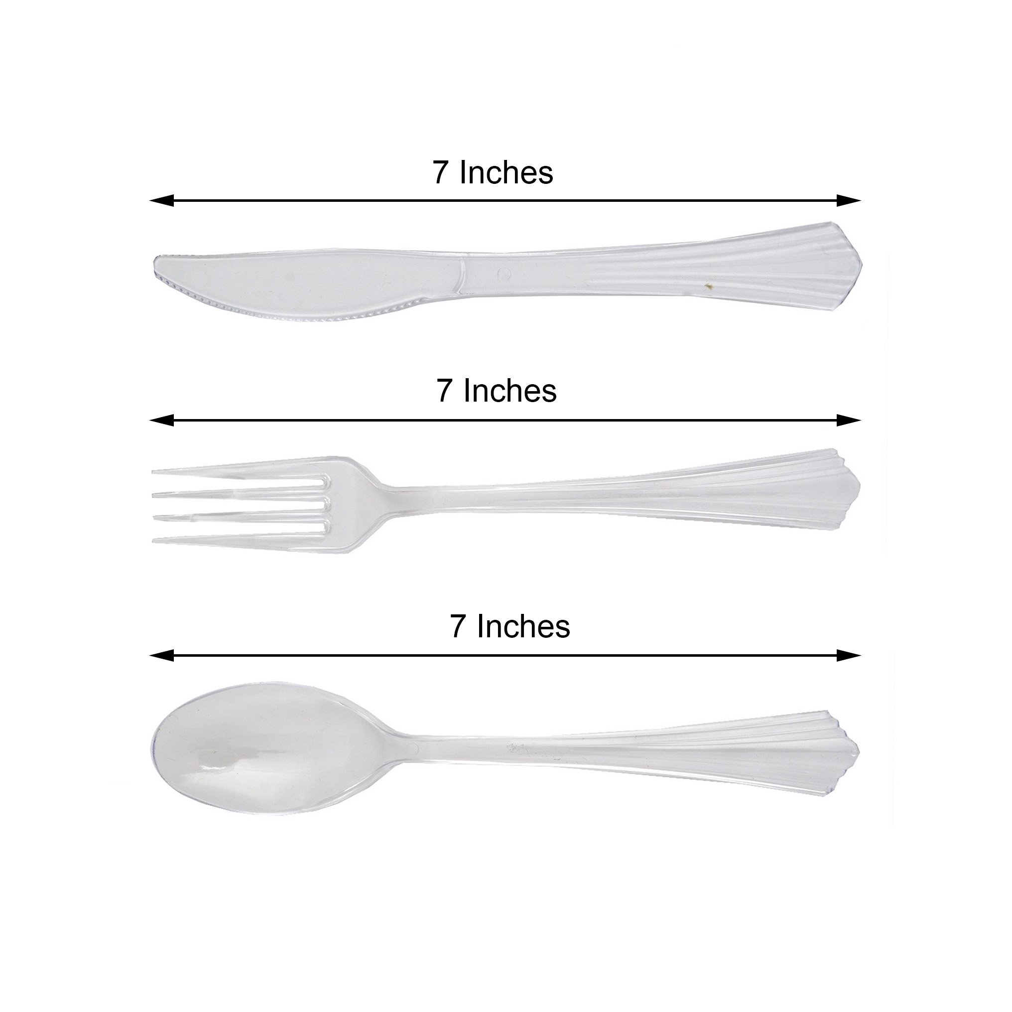 Crafted from high-quality plastic, this set of utensils will bring elegance to your decorations and will make setting your tabletops a snap.
