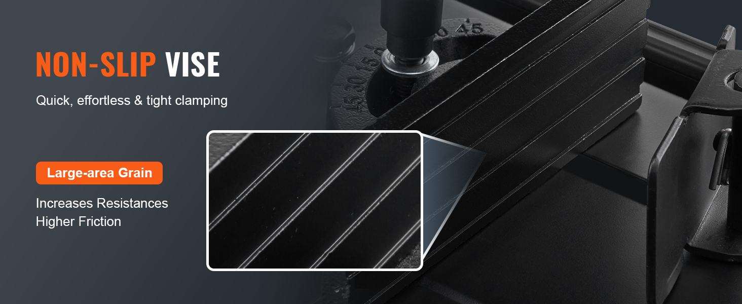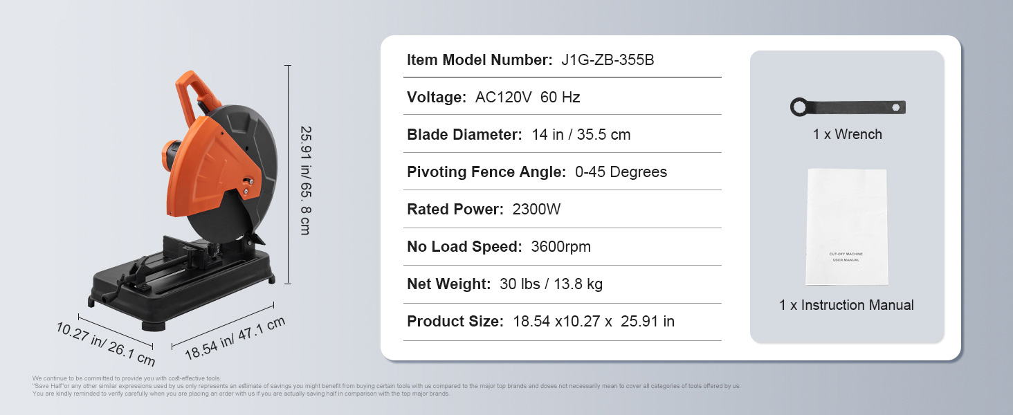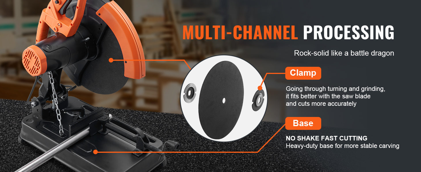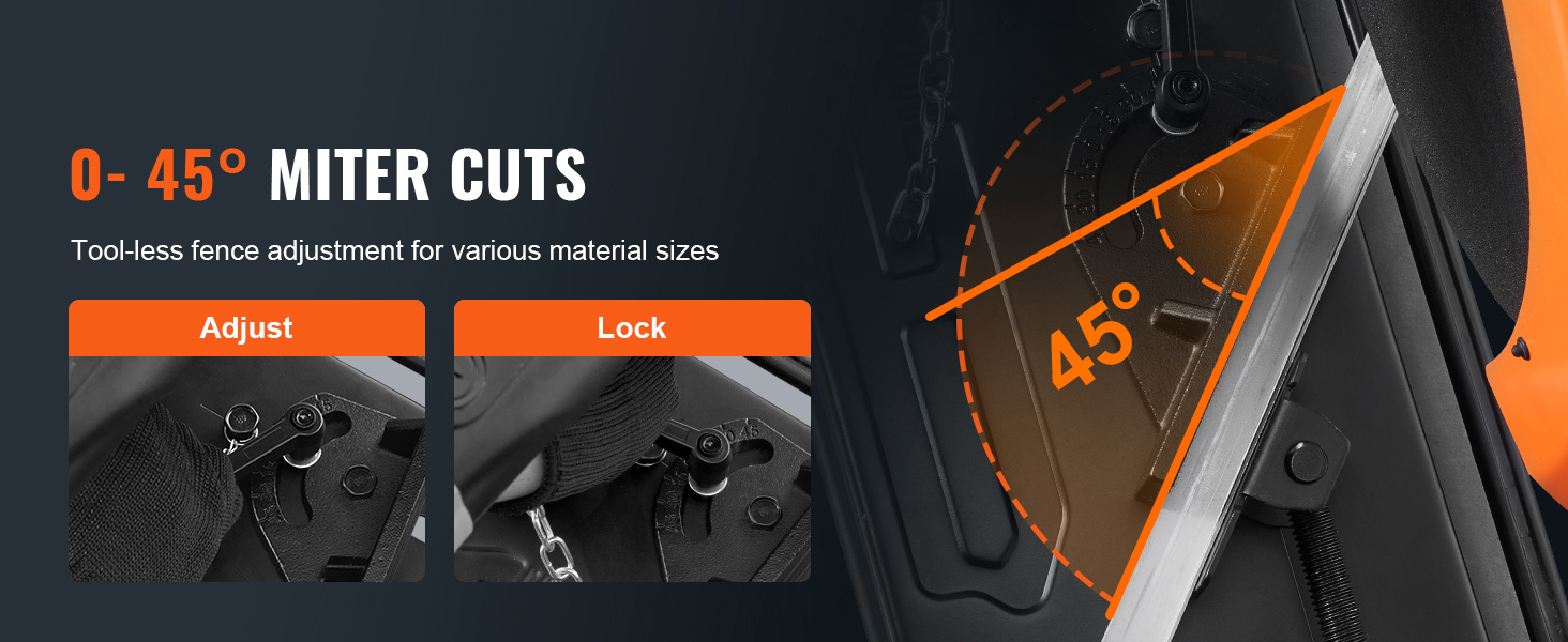 Do you have varying cutting needs? Our 14in abrasive chop saw comes with 0-45°vise angle adjustment for multi-angle cuttings. You can use it to finely cut different materials such as angles, steel bars, solid iron columns, aluminum profiles, square tubes, etc.