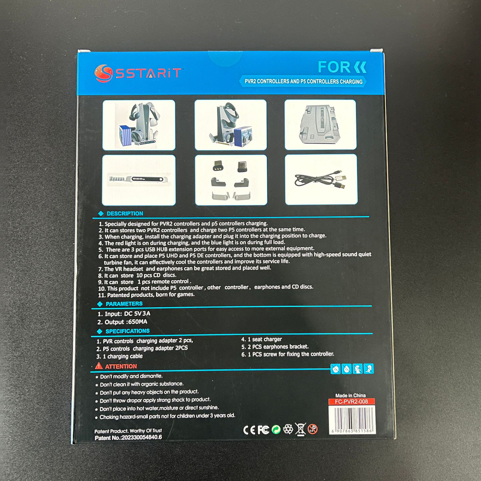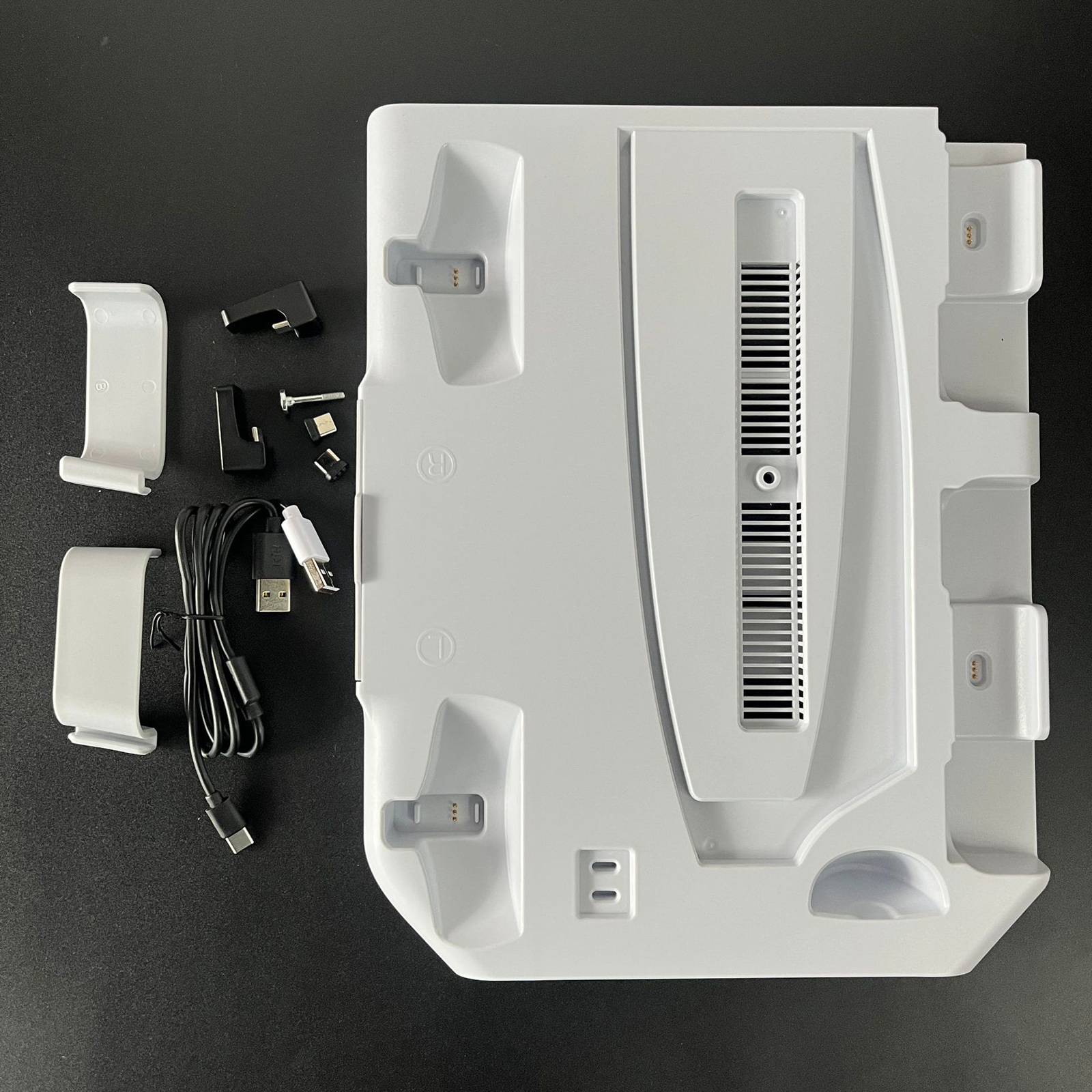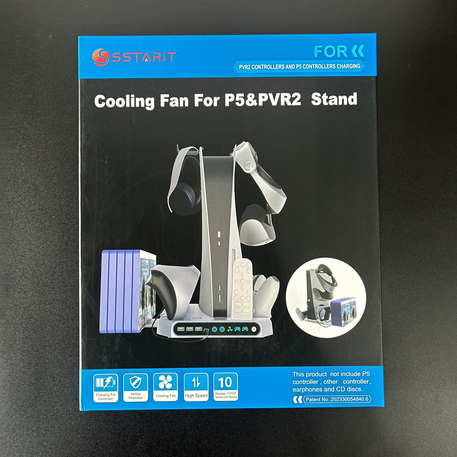 Cooling Base Cooling Fan Cooling Stand Dock with Disc Storage for PSVR2 Stand Features: l Specially designed for PVR2 controllers and P5 controllers charging l It can stores two PVR2 controllers and charge two P5 controllers at the same time l When charging, install the charging adapter and plug it into the charging position to charge l The red light is on during charging, and the blue light is on during full load l This product not include P5 controller, other controller, earphones and CD discs Specification: l Input: DC 5V3A l Output :650MA l Applicable Model: for PSVR2 PS5 Package: l 1x Cooling Stand Set