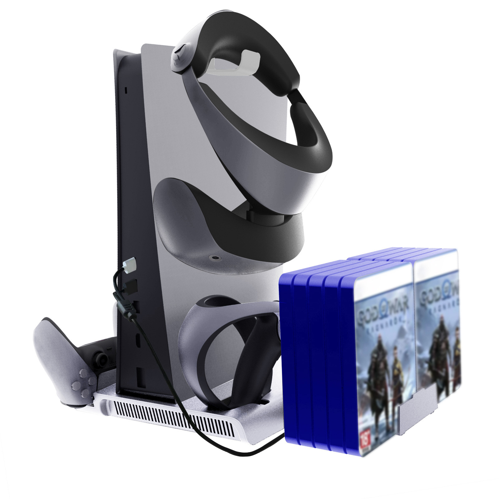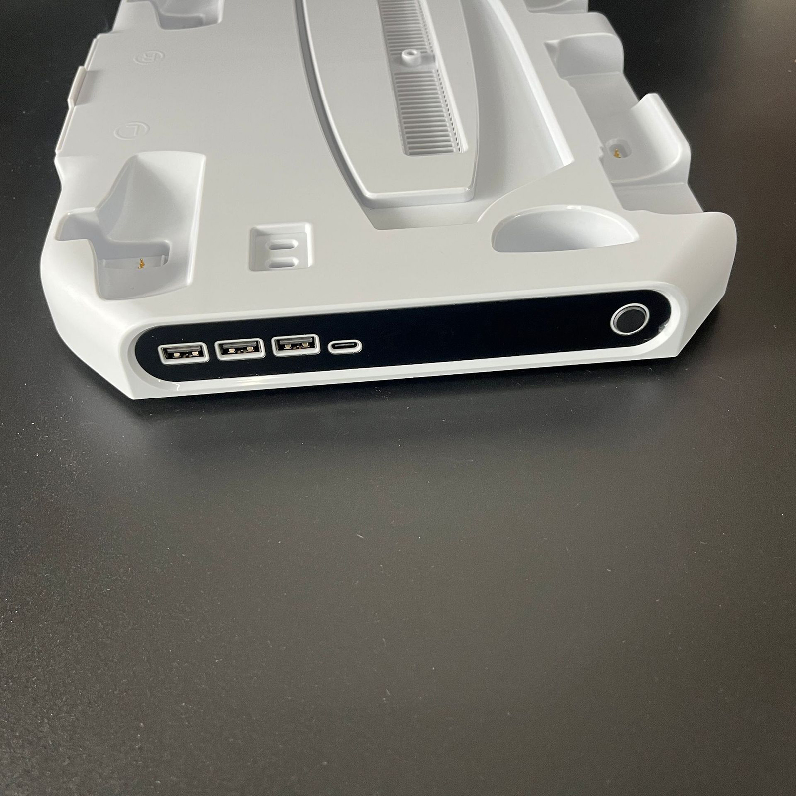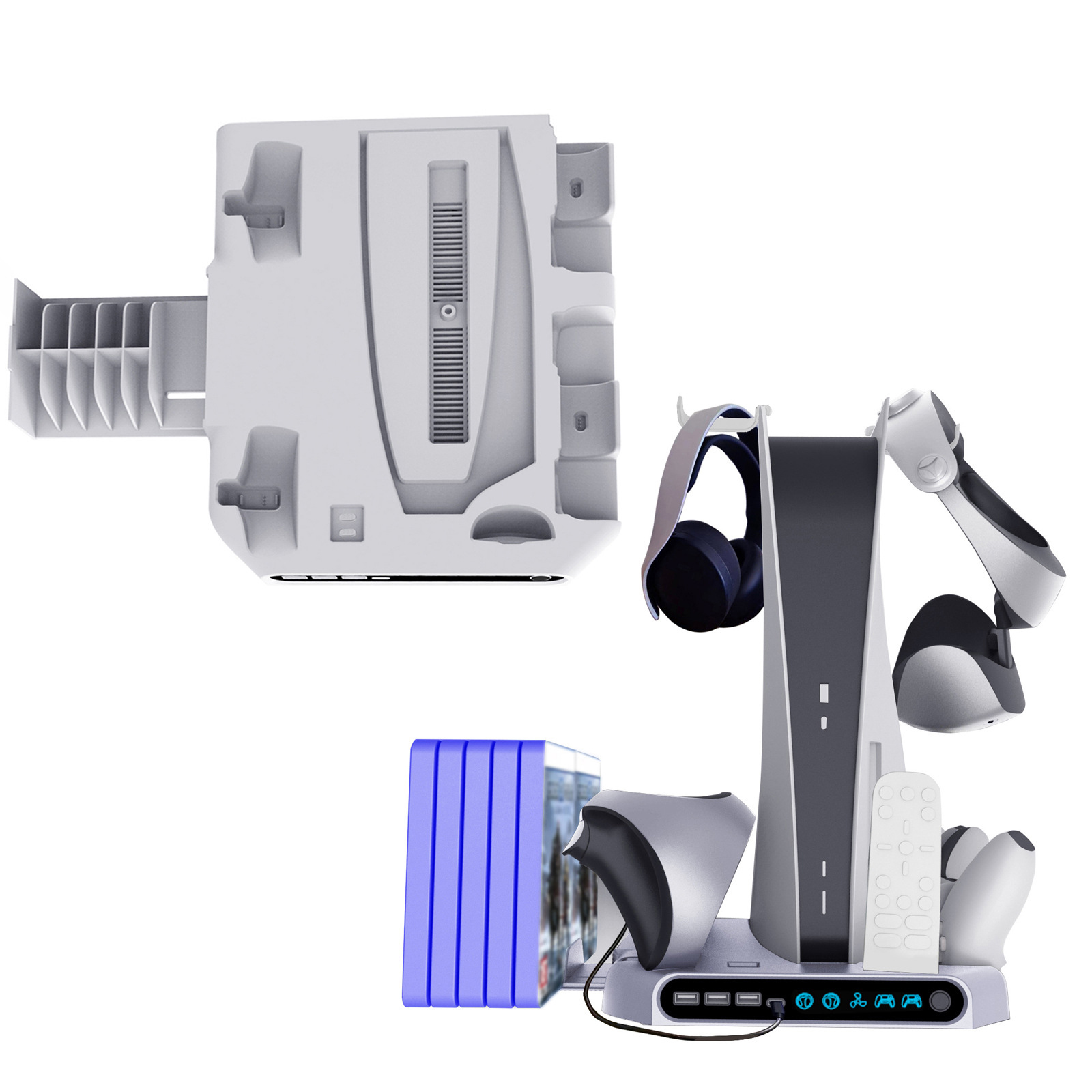 Cooling Base Cooling Fan Cooling Stand Dock with Disc Storage for PSVR2 Stand Features: l Specially designed for PVR2 controllers and P5 controllers charging l It can stores two PVR2 controllers and charge two P5 controllers at the same time l When charging, install the charging adapter and plug it into the charging position to charge l The red light is on during charging, and the blue light is on during full load l This product not include P5 controller, other controller, earphones and CD discs Specification: l Input: DC 5V3A l Output :650MA l Applicable Model: for PSVR2 PS5 Package: l 1x Cooling Stand Set