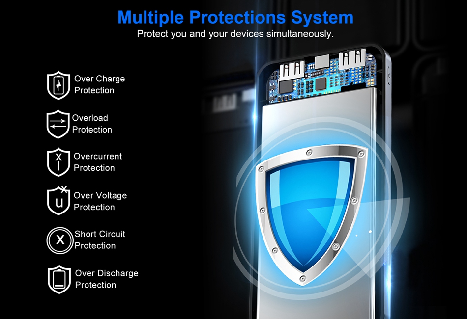 - Superior Safety:Built in advanced circuits and high efficiency power management,our portable phone charger protects itself and electronic devices from overcharging,over-discharging,short-circuiting,over-current and high-temperature protection..