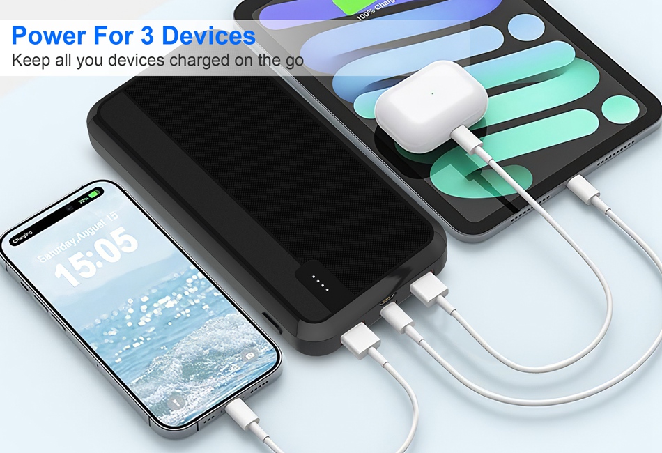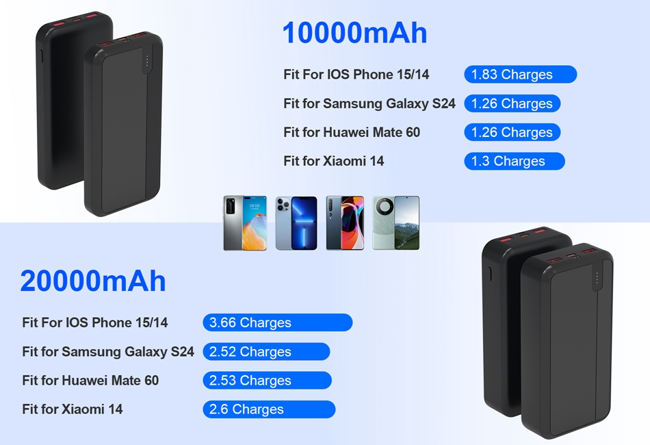 - PD22.5W Fast Charging Power Bank:The massive 10000mAh/20000mAh battery capacity offers PD22.5W fast charging,perfect for someone who always on the . Twin USB ports and 1 Type-C port allow you to charge 3 devices at the same time. The 10000mAh power bank provides 1.83 charges for IOS Phone 15/14. The 20000mAh power bank offers 3.66 charges for IOS Phone 15/14. Easily satisfy your urgent charging needs.