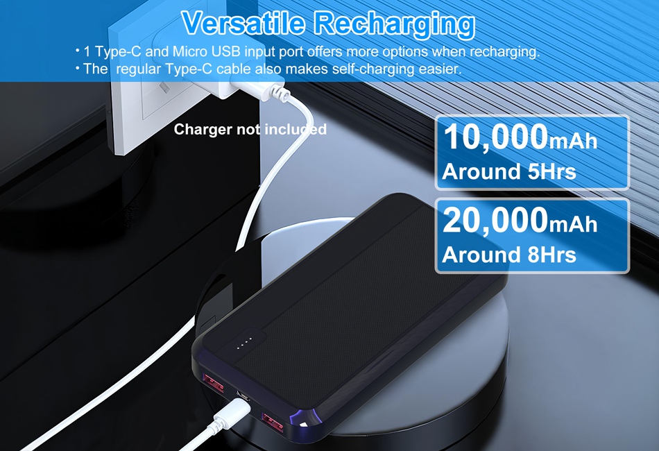 - Versatile Recharging:With 1 Type-C and Micro USB input port,you have more options when recharging this fast charging power bank. The 4 power indicators can also be a friendly reminder when the power bank needs to be recharged.