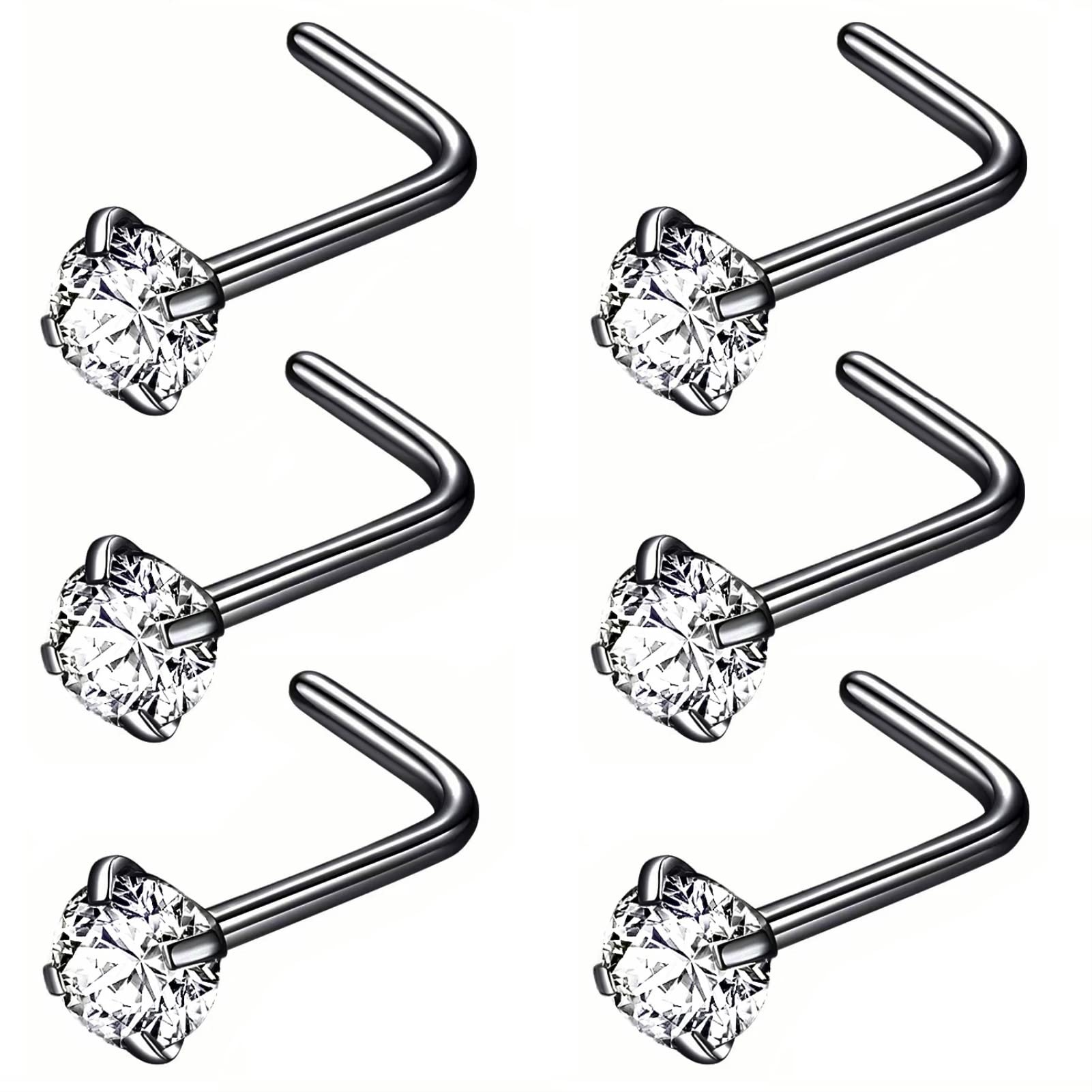 Quantity: 6pcs 3.0mm CZ nose stud. This L shaped nose studs for women size: Bar thickness: 20 gauge (0.8mm), Pin Length:6.5mm, Prong set cubic zirconia: 3.0mm, These stones a very bright and prong set by hand for accuracy.