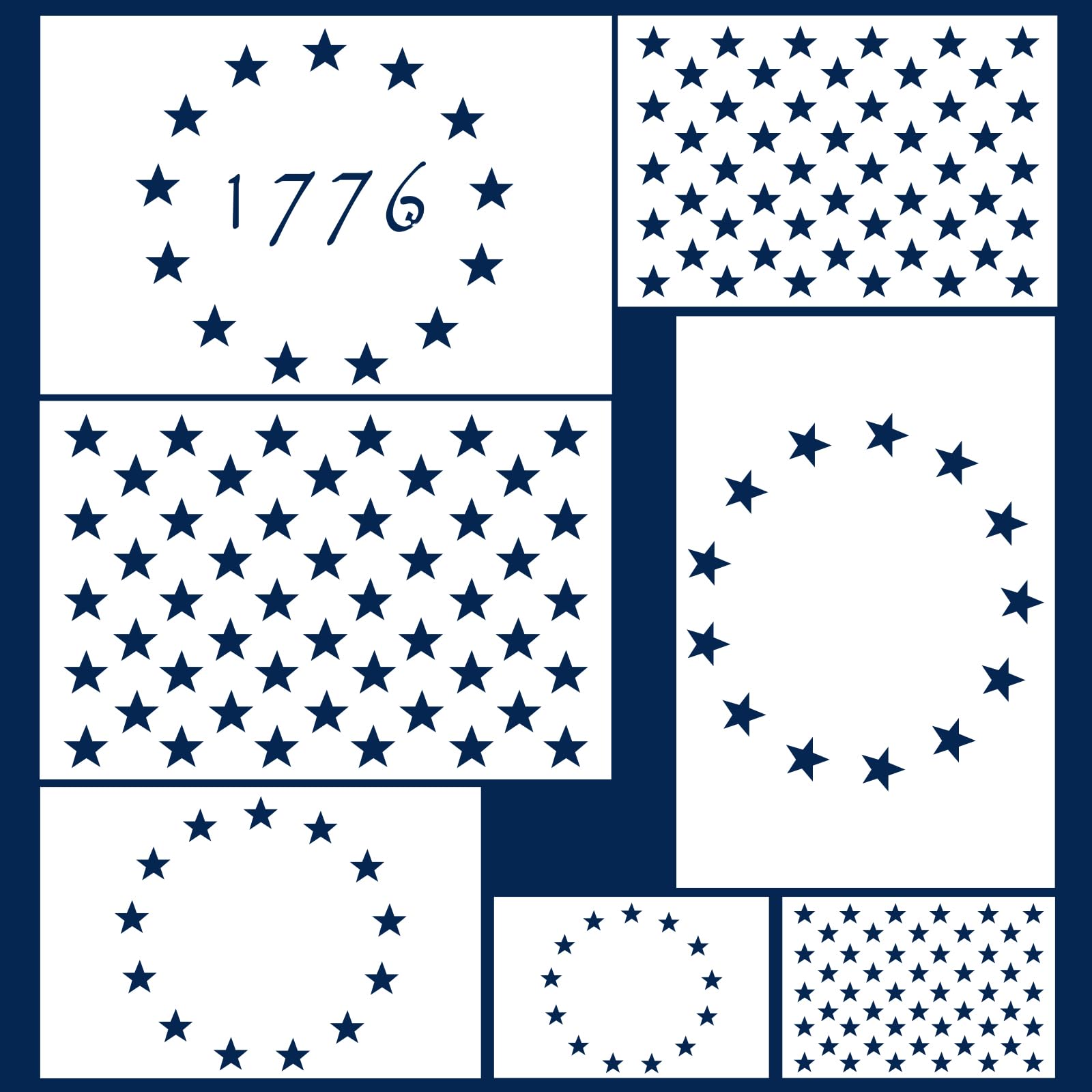 Package Included - 7 x Stencil Template with Different American Elements (featuring 3 sheets of 50-star template in different sizes, 3 sheets of 13-star templates in different sizes, 1 sheet of 1776 template)