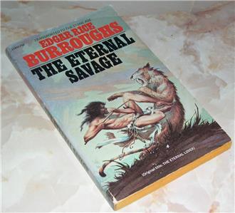 THE ETERNAL SAVAGE-- While visiting Tarzan in his African jungle home, an American girl falls into the most astonishing science fiction adventure of all. By a quirk in time, a white skinned savage from the stone age is thrust forward to modern days long enough to meet her and bring her back to his own world of cave people, sabertooth tigers and prehistorical wilderness. Written in 1914.