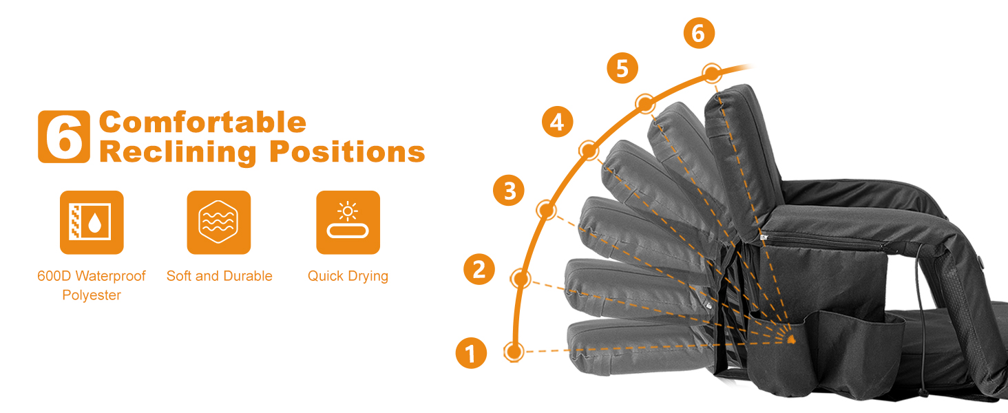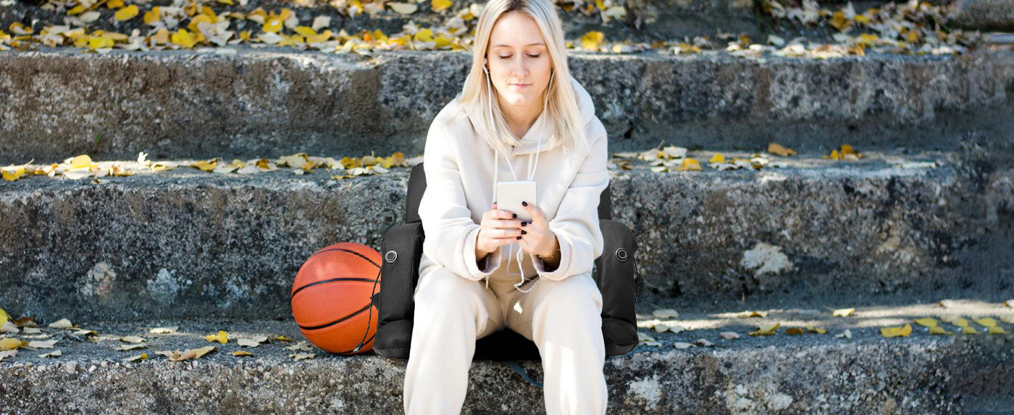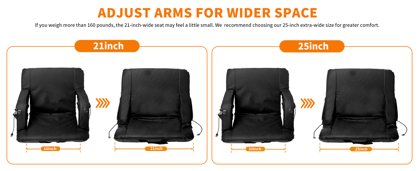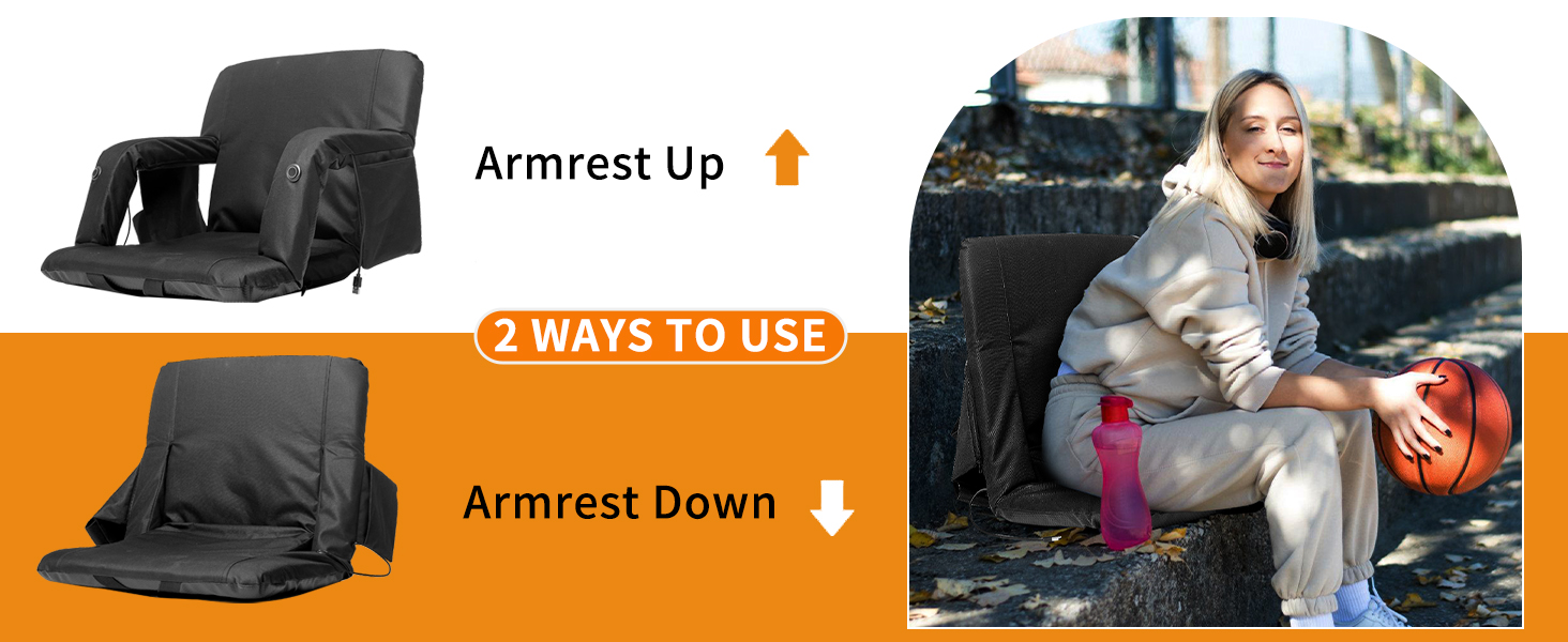 21"/25" heated stadium seats is heated by USB power supply and can be used with any USB battery for several hours. 3 levels control the heating temperature: High, Medium and Low. The heated folding chair can be heated to a maximum of 140 °F. With 6 different reclining adjustments, allowing you to choose according to your needs. The armrests are also adjustable. Our stadium seating for bleachers with multiple pockets where you can conveniently store your bottles, snacks, and personal items. With 2 shoulder straps, it can be easily carried like a backpack. This means you can take it anywhere you go. Best choice for any outdoor activity, picnic, camping and a fishing trip.