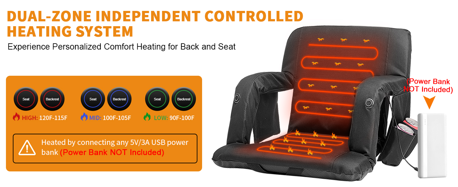 Heated Bleacher Seats: Our stadium chairs for bleachers with back support are heated by USB power. Press the temperature control switch to warm up the back and bottom of the heated seat. And the double heated stadium seat is divided into 3 heating modes, high, medium and low, and the max temperature can be heated to a max of 140°F. (Note: USB power bank is not included, and we recommend using a power supply above 10W.)