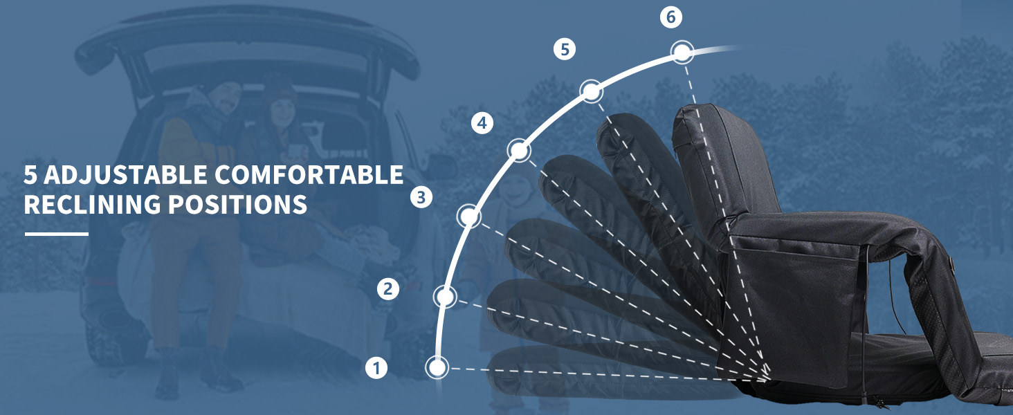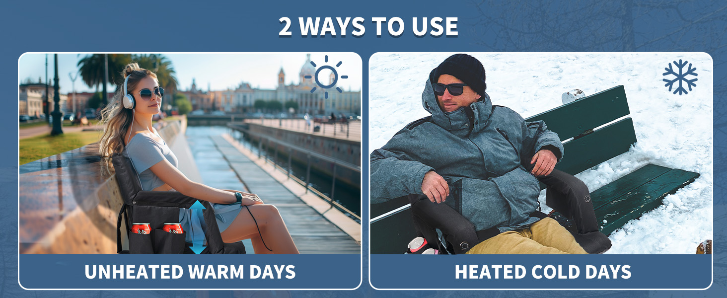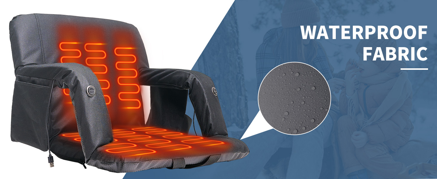 21"/25" heated stadium seats is heated by USB power supply and can be used with any USB battery for several hours. 3 levels control the heating temperature: High, Medium and Low. The heated folding chair can be heated to a maximum of 140 °F. With 6 different reclining adjustments, allowing you to choose according to your needs. The armrests are also adjustable. Our stadium seating for bleachers with multiple pockets where you can conveniently store your bottles, snacks, and personal items. With 2 shoulder straps, it can be easily carried like a backpack. This means you can take it anywhere you go. Best choice for any outdoor activity, picnic, camping and a fishing trip.