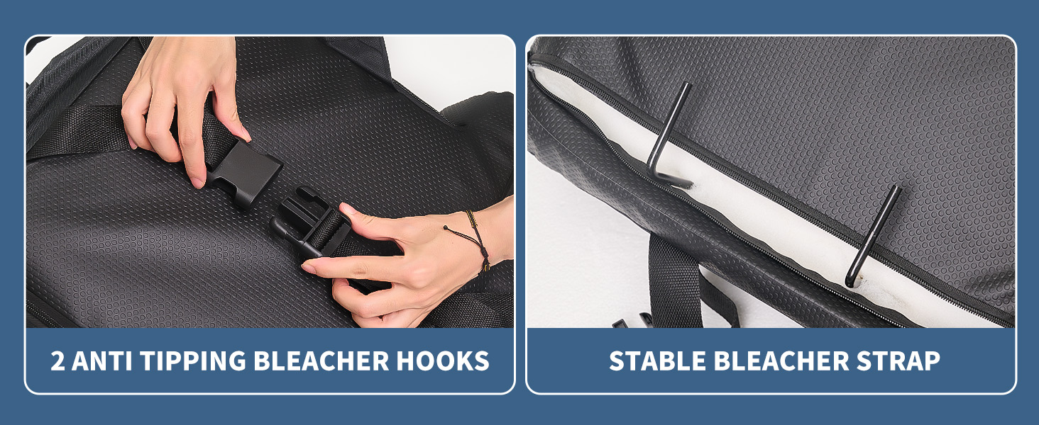 Large Storage Space: The bleacher seats with backs and cushion wide has 3 hidden pockets. Armrests on both sides of the seat have hidden zippered pockets. There is also a huge pocket on the back of the seat. Conveniently store your personal items such as snacks, eyes, tissues and more. Special mesh pocket cup holder design prevents drinks from spilling. These pockets are hidden under the zipper, which does not take up space or affect the appearance.