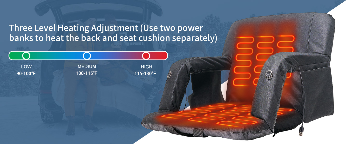 Heated Bleacher Seats: Our stadium chairs for bleachers with back support are heated by USB power. Press the temperature control switch to warm up the back and bottom of the heated seat. And the double heated stadium seat is divided into 3 heating modes, high, medium and low, and the max temperature can be heated to a max of 140°F. (Note: USB power bank is not included, and we recommend using a power supply above 10W.)