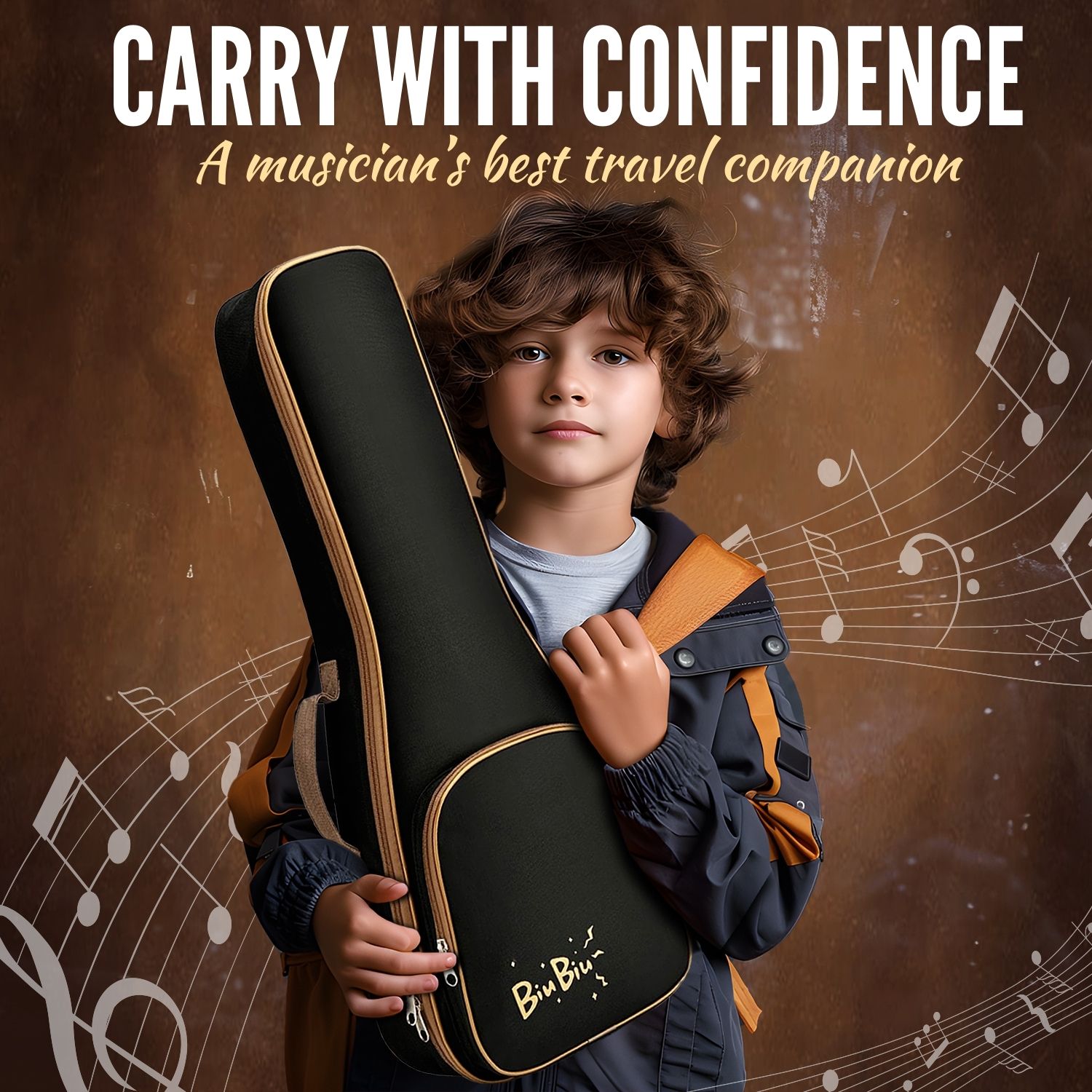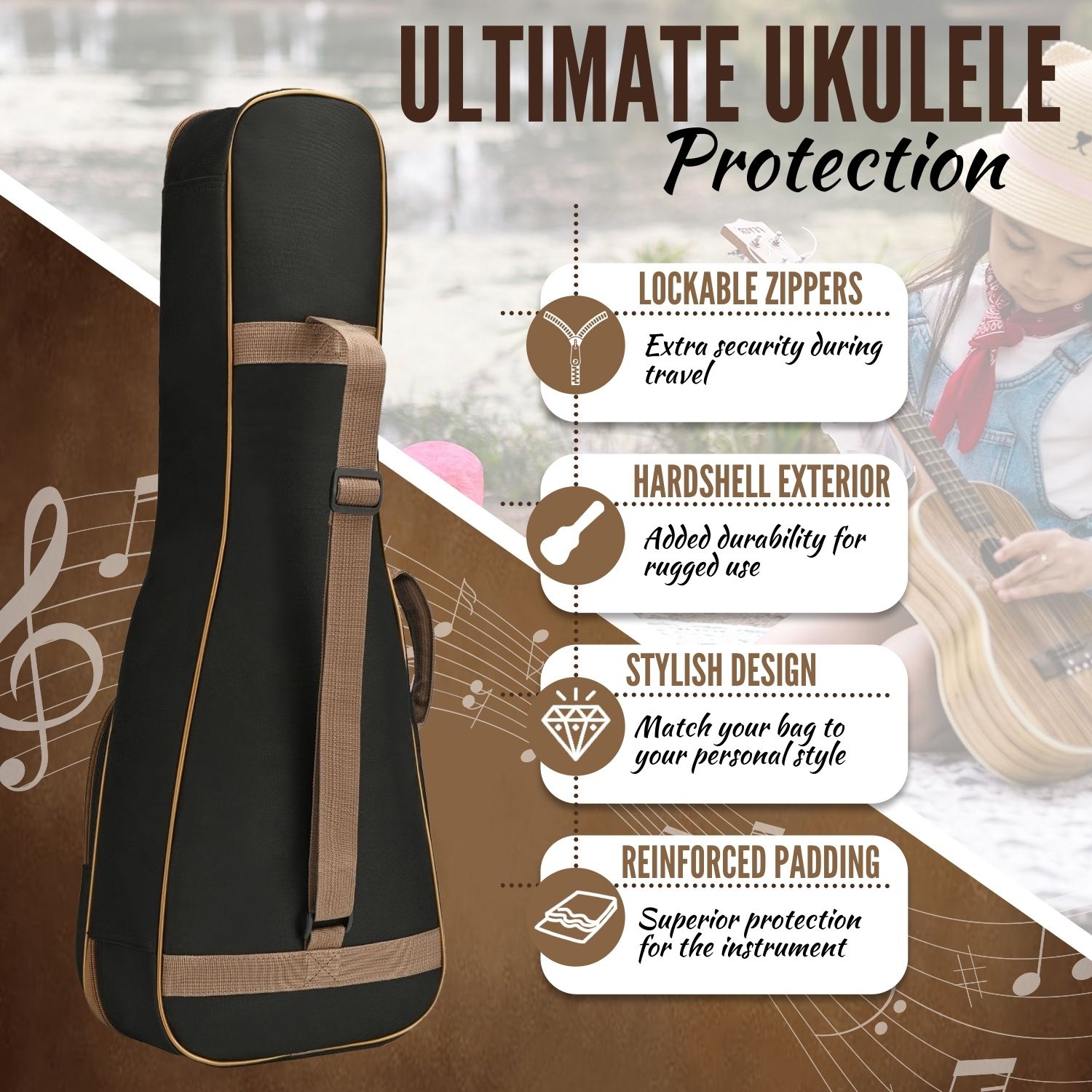The Ukulele is a lovely instrument, but mechanical wear and tear and moisture can damage it. The best way to avoid this is to obtain our ukulele case, which will undoubtedly meet your unique requirements. Suppose you're interested in selecting the appropriate ukulele size for your needs. There are three options available to help you find the perfect fit. This will guarantee that your Ukulele fits snugly in its case. It is important to keep your Ukulele from getting struck by accident. This ukulele travel case is straightforward to move around. You can take your Ukulele to a jam session, class, or school performance. The soft felt interior of the ukulele case would provide excellent protection for the instrument. The Neck is durable and well-constructed to maintain the guitar's stability during transport. The headstock is securely stored within the case, protecting the instrument from impacts and preventing cracks. This case is constructed from a high-quality, abrasion-resistant nylon material that protects your instrument from bumps and moisture. There is a front accessory pocket for holding items such as a tuner, additional strings, or a Ukulele capo. Have everything you need, from tools to cables, in a portable location. You must also select the correct case size for your Ukulele.Feature: