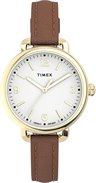 • Timex Womens Standard Demi 30mm Watch - White Dial Gold-Tone Case with Brown Genuine Leather Strap.