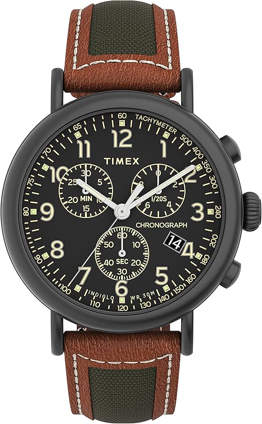 • Timex Mens Standard Chronograph 41mm Watch - Gunmetal Case Black Dial with Brown Genuine Leather & Olive Fabric Strap.