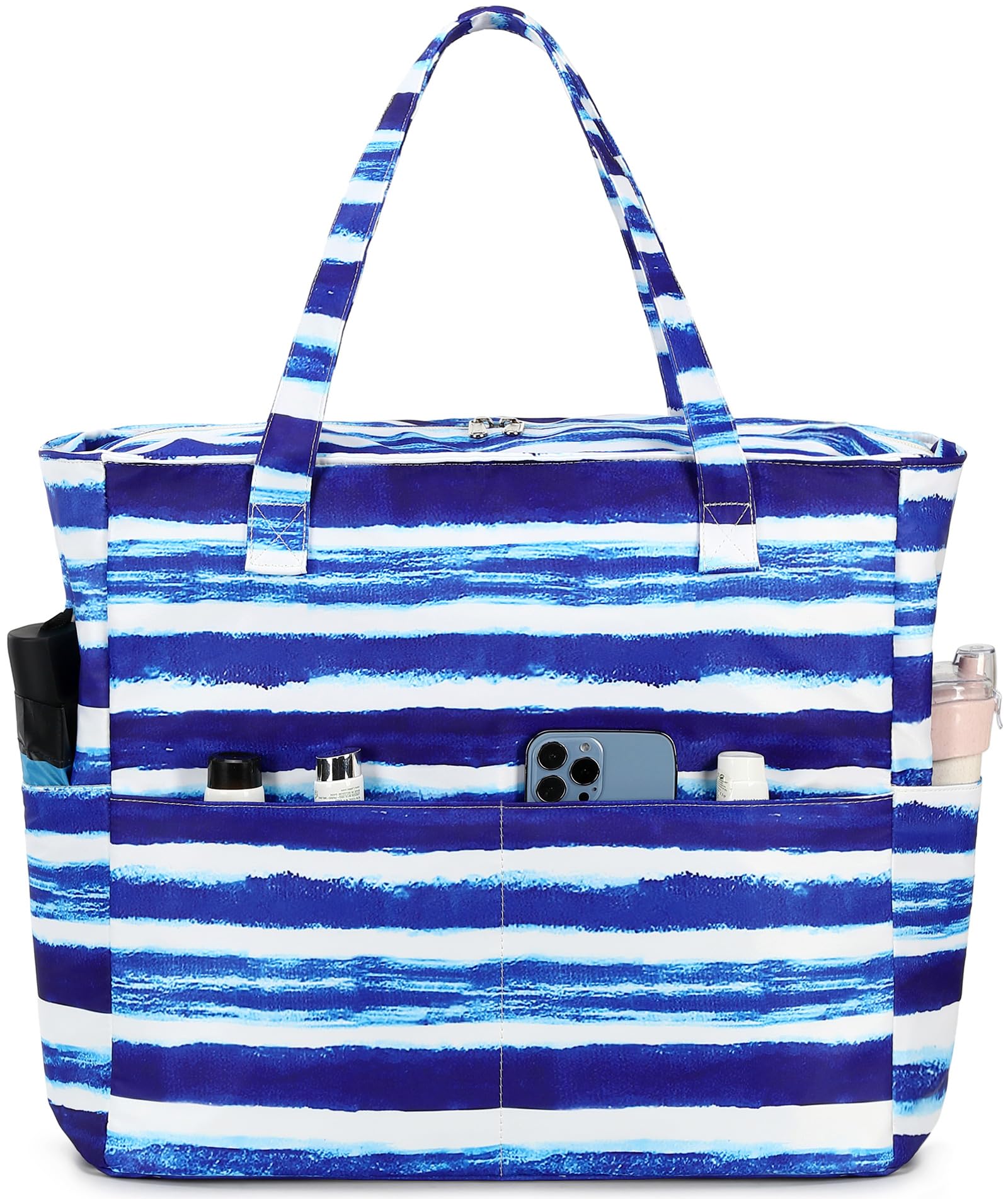 Waterproof Beach Tote Pool Bags for Women Ladies Extra Large Gym Tote Carry On Bag With Wet Compartment for Weekender Travel (Blue white stripes)