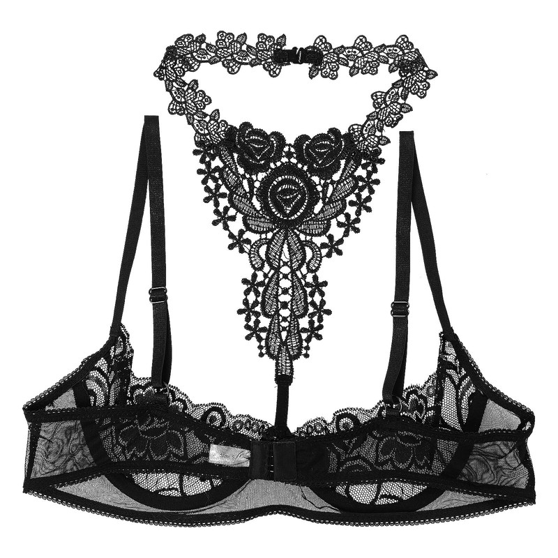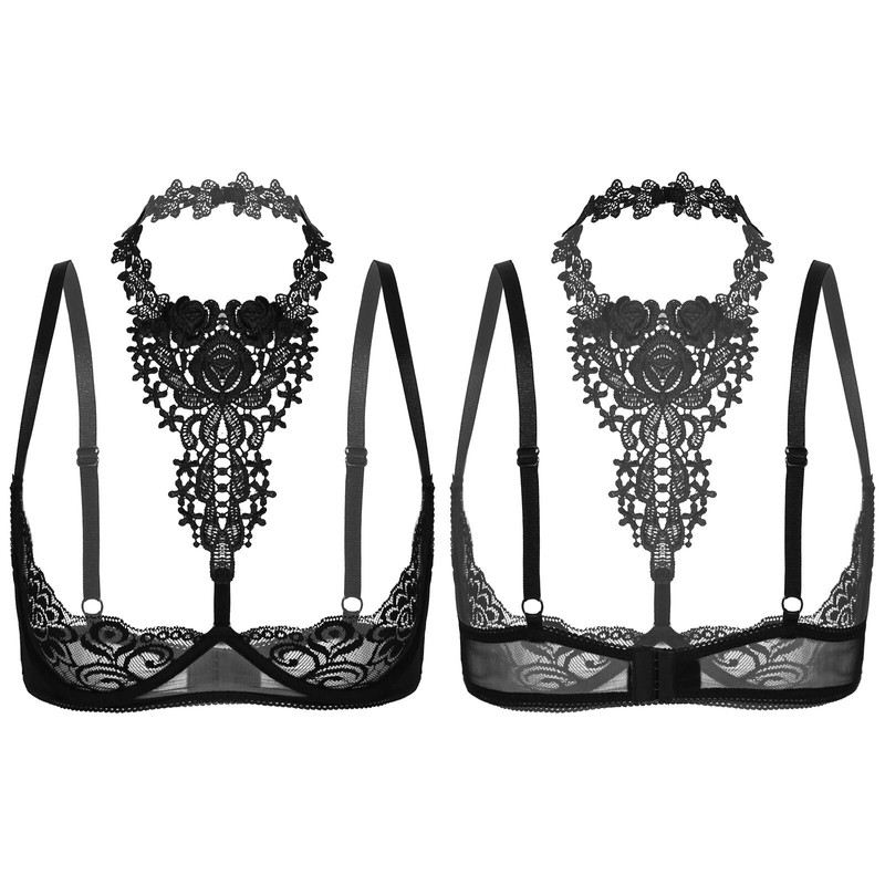 Halter neck, bare breast, see-through floral lace, looks hot and alluring.