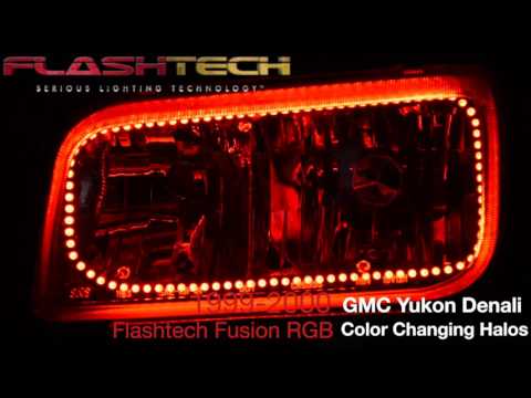 GMC Yukon Denali V.3 Fusion Color Change LED Halo Headlight Kit 1999-2000, originally designed and uniquely manufactured by Flashtech, are the most advanced halo kit ever designed. Flashtech's Fusion color changing technology eliminates the frustration of choosing just one halo color and enables complete halo customization with the press of a button.