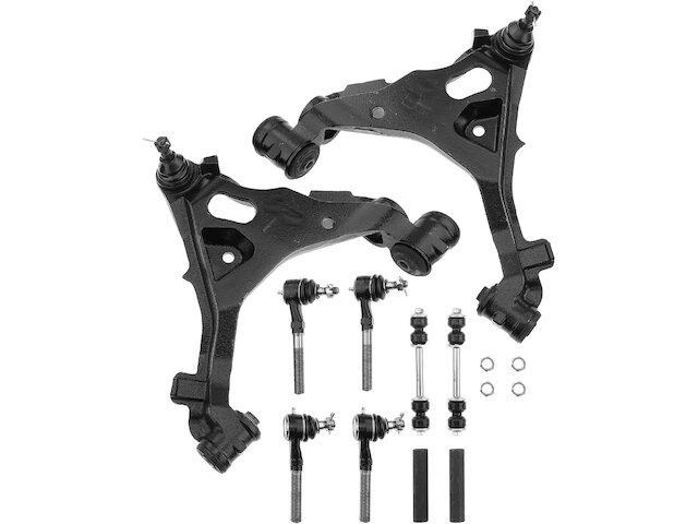 Package Contents: 1x Front Left Lower Control Arm & Ball Joint Assembly; 1x Front Right Lower Control Arm & Ball Joint Assembly; 2x Front Sway Bar Link; 1x Left Outer Tie Rod End; 1x Right Outer Tie Rod End; 1x Left Inner Tie Rod End; 1x Right Inner Tie Rod End; 2x Steering Tie Rod End Adjusting Sleeve
