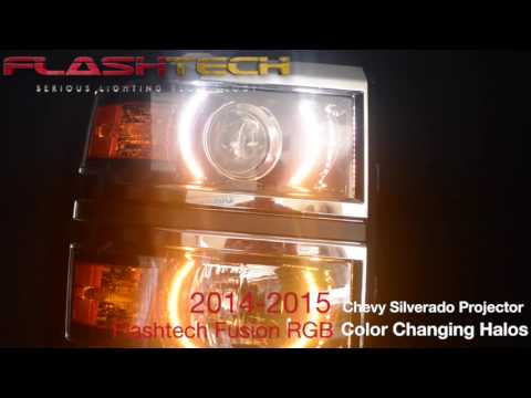 Chevrolet Silverado Projector 2014-2016 V.3 Fusion Color Change LED Halo Headlight Kit with RF Remote, originally designed and uniquely manufactured by Flashtech, are the most advanced halo kit ever designed. Flashtech's Fusion color changing technology eliminates the frustration of choosing just one halo color and enables complete halo customization with the press of a button.
