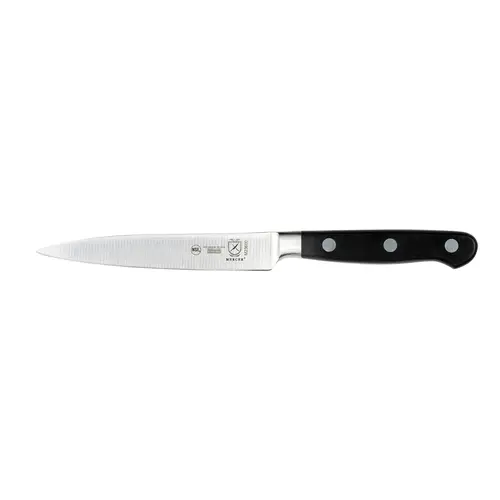 The Mercer Culinary M23600 Renaissance 5-Inch Utility Knife is a versatile and essential tool for any foodservice establishment. Crafted with precision, this knife features a high-carbon German steel blade that is forged for strength and durability, ensuring it can handle a variety of kitchen tasks with ease. The blade's sharp, finely-honed edge is perfect for slicing, dicing, and chopping small to medium-sized fruits, vegetables, and meats, making it an ideal choice for both prep work and finishing touches.