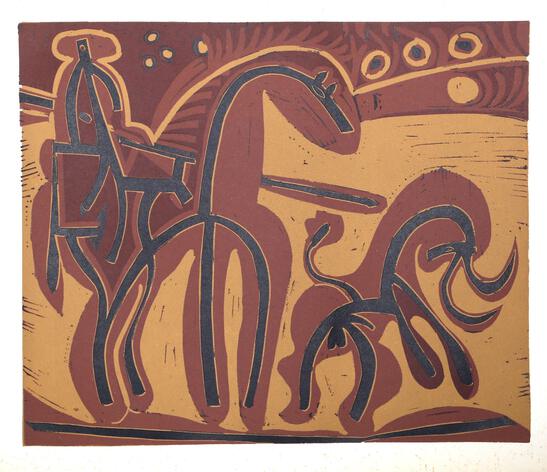 With flowing lines and ovular forms, Pablo Picasso's rendering of a picador engaged in a bullfight is warm and energized.