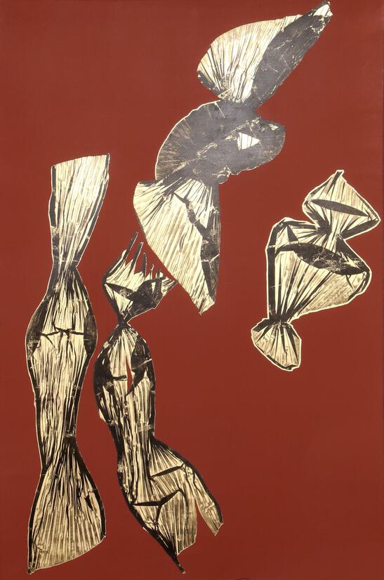 Known mostly as a sculptor, this signed print by American Abstract artist Lynda Benglis has sculptural objects floating on a brown background.