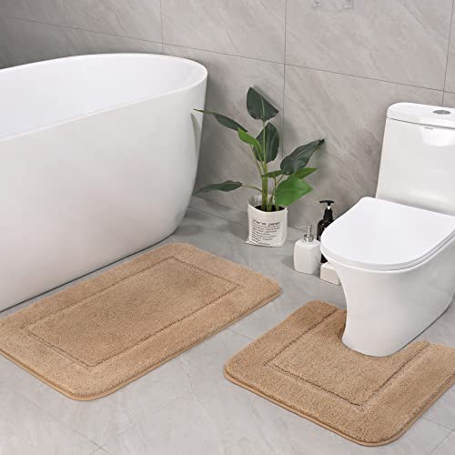 Bathroom Rug Set Beige, Soft Bath Rug Set 2 Piece Set, Toilet Mat U-Shaped 20x20 and 34x20 Bathroom Rugs, Quickly Dry Mats for Bathroom, Tub, Washable, Super Absorbent Floor Mat
