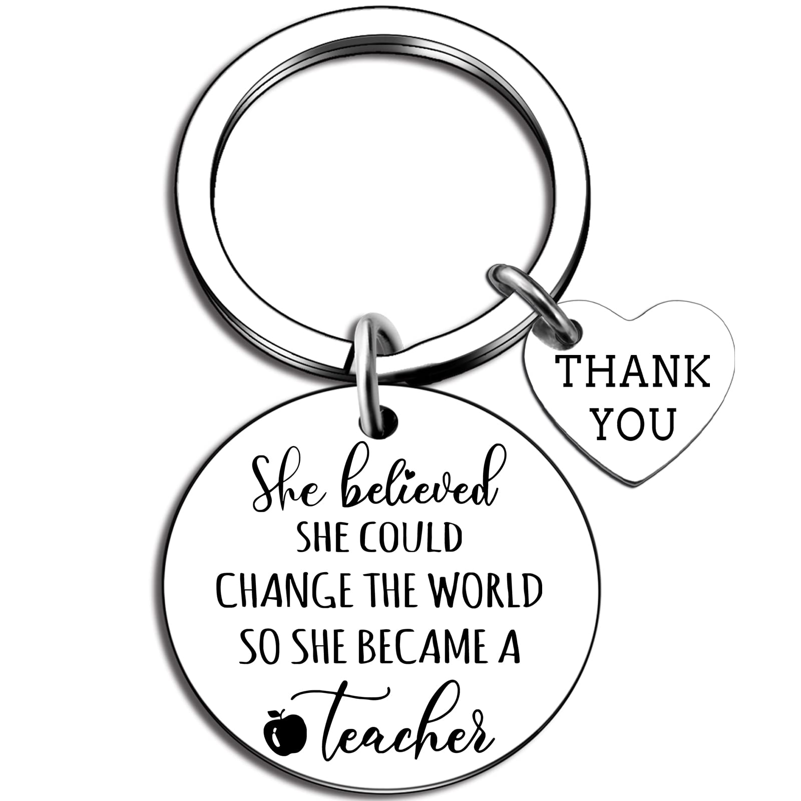 Description It Engraved With Meaningful Words“ She Believed She Could Change The World, So She Became a Teacher”, It Is The Perfect Gifts For Your Teachers And Professors. Our Keychains Are Crafted From High-Quality Materials And Feature Unique And Heartfelt Designs That Capture The Essence Of What It Means To Be a Great Teacher. This Keychain Gifts Made Of High Quality Stainless Steel And Will Arrive In a Pretty Velvet Bag. Appreciation Gift, Graduation Gifts, Valentine's Day Gifts, Retirement Gift For Teachers, Professors, Female, From Students, Your Teacher Will Cherish This Gift Forever. Suitable For Important Occasions, Such As End-Of-Year Gifts, Teacher Retirement, Teacher‘s Day, First Day Of School, Graduation Season, Christmas, Etc. If You Have Any Questions Or Suggestions About Our Products, Please Us In Time. Package Includes: 1*Teacher Keychain 1*Free Velvet Packaging Bag