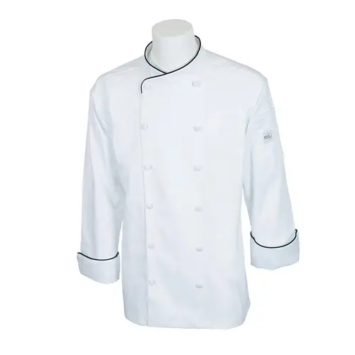 The Mercer M62020WB5X men's chef jacket is a professional-grade garment designed for both comfort and durability in busy kitchen environments. Made from a blend of polyester and cotton, it offers a balance of breathability and strength, making it ideal for long shifts. The jacket features a traditional double-breasted design with a snap closure, providing a polished and professional appearance.