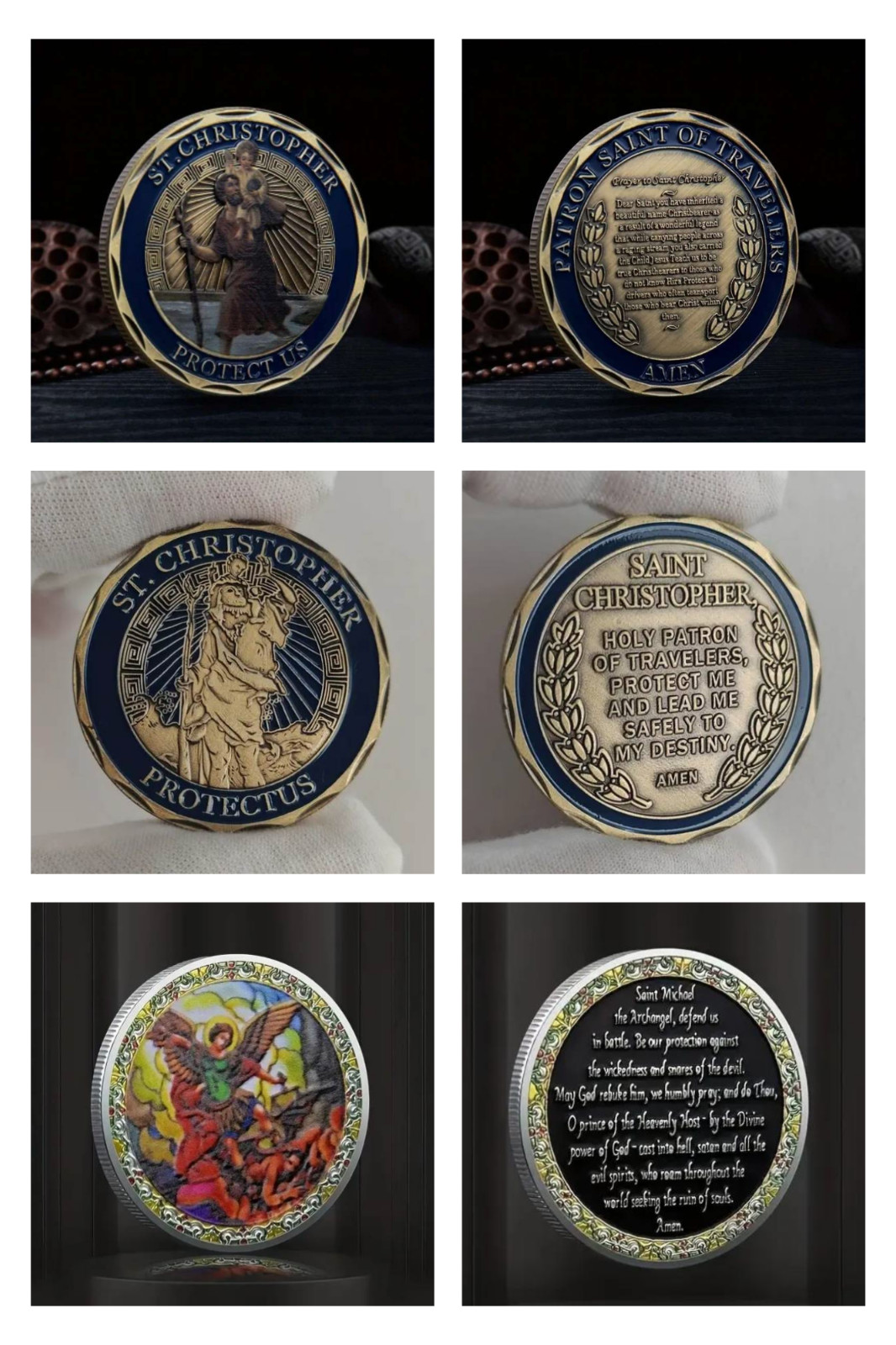 This listing includes a selection of St. Christopher (Patron Saint of Travelers) and St. Michael the Archangel (Protector in Battle) coins. Each coin features detailed engravings and heartfelt prayers for guidance, safety, and spiritual strength.